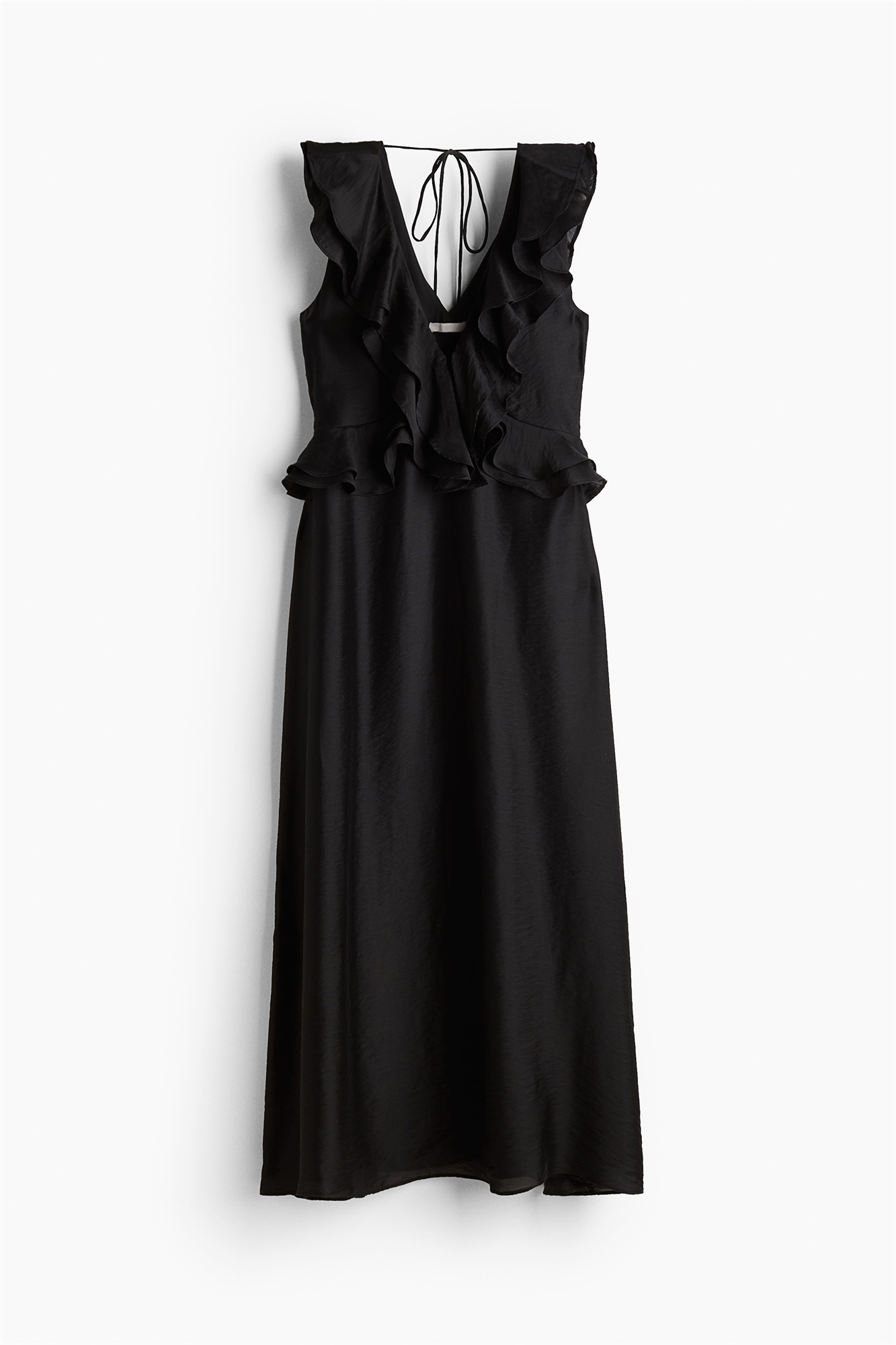 Длинное платье без рукавов из тканого материала из смеси лиоцелла. Глубокий V-образный вырез спереди и сзади с узкими горизонтальными завязками на шее. Двухслойные воланы на плечах и на талии, потайная застежка-молния с одной стороны. На подкладке.