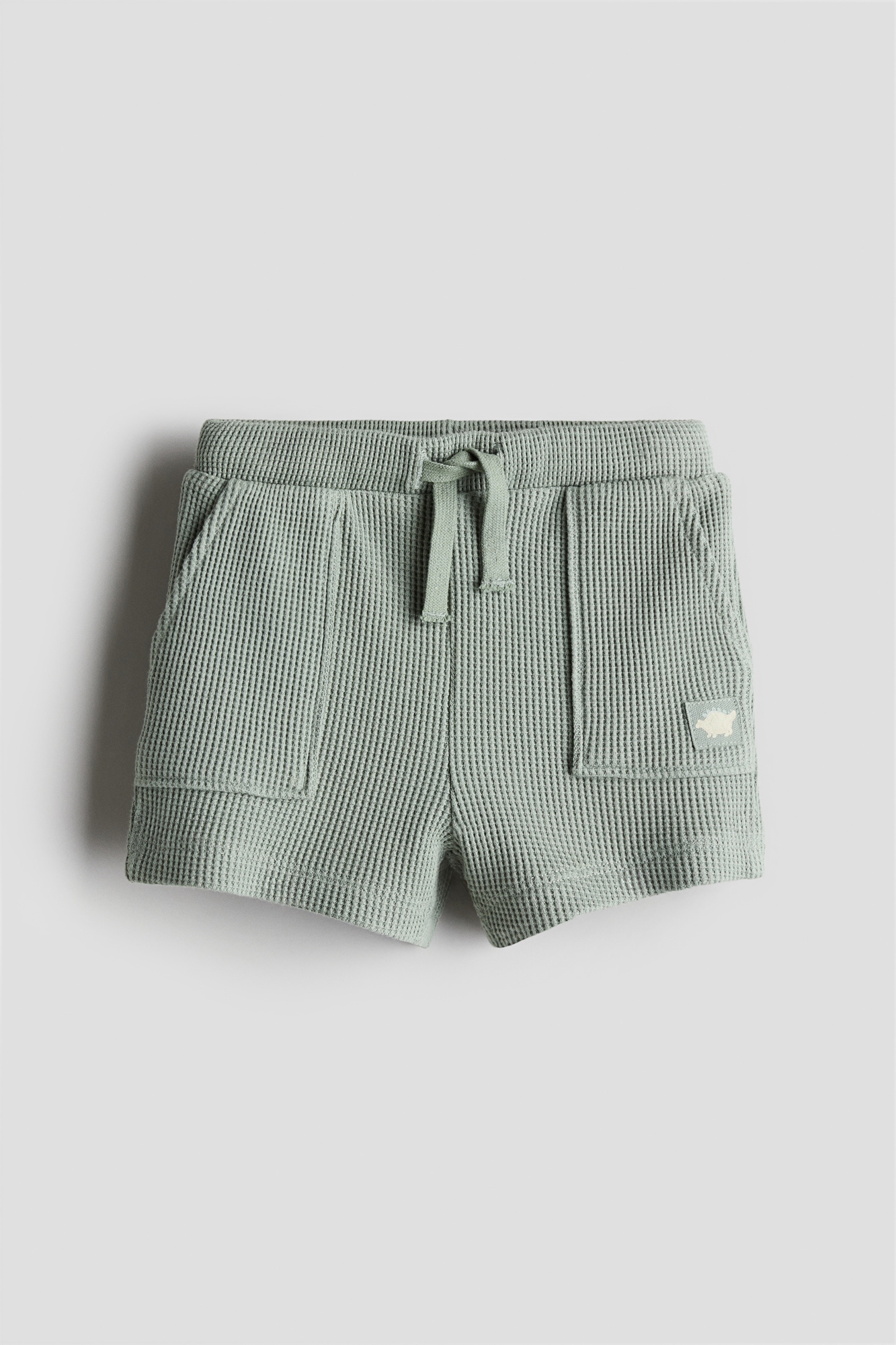 Шорты из хлопковой ткани с эластичным утягивающим поясом и диагональными накладными карманами спереди.