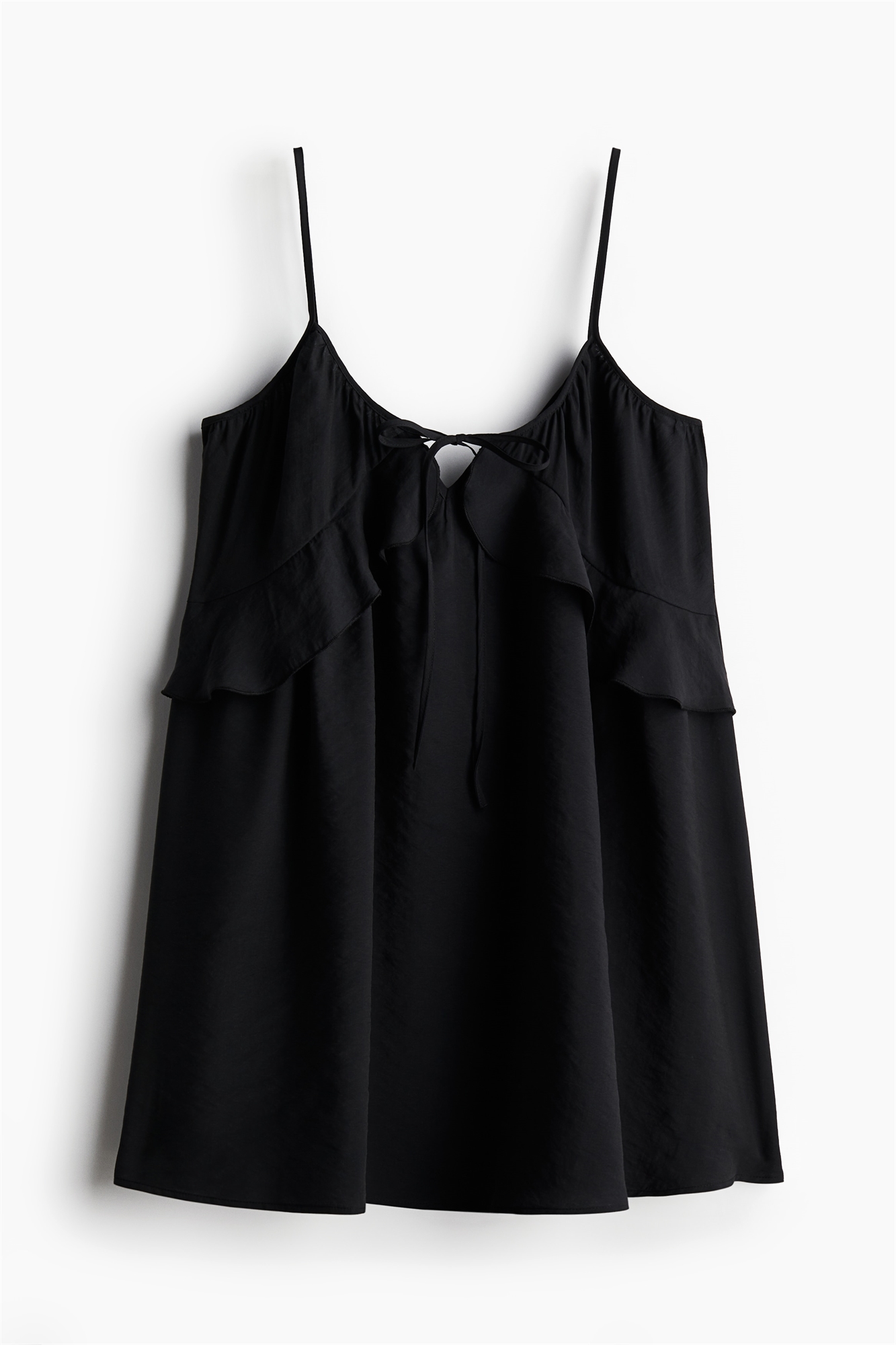 Короткое платье свободного кроя из модальной смеси с бретельками-спагетти и глубоким круглым вырезом с узкими завязками спереди. Отделка воланами под бюстом и подол прямого кроя. Без подкладки.