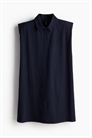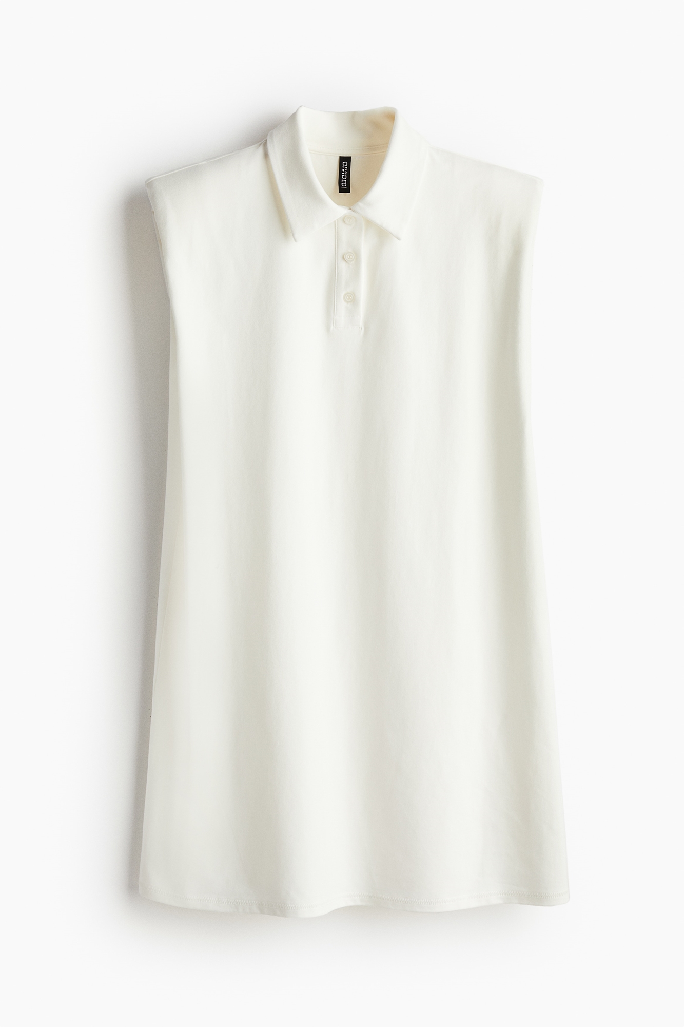 Платье без рукавов из мягкого хлопкового джерси с двухслойным воротником, застежкой на пуговицы, подплечниками и прямым покроем.