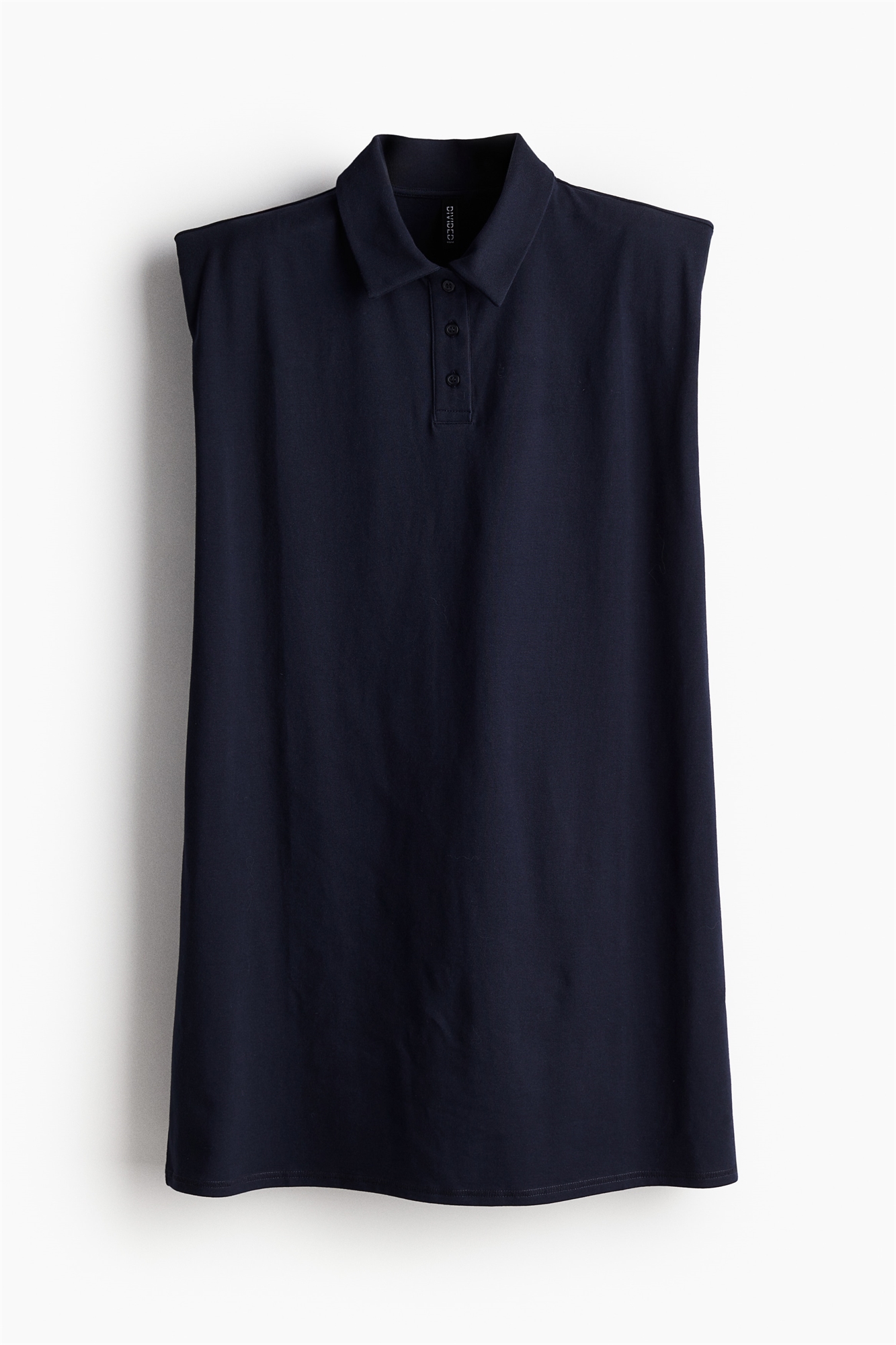 Платье без рукавов из мягкого хлопкового джерси с двухслойным воротником, застежкой на пуговицы, подплечниками и прямым покроем.