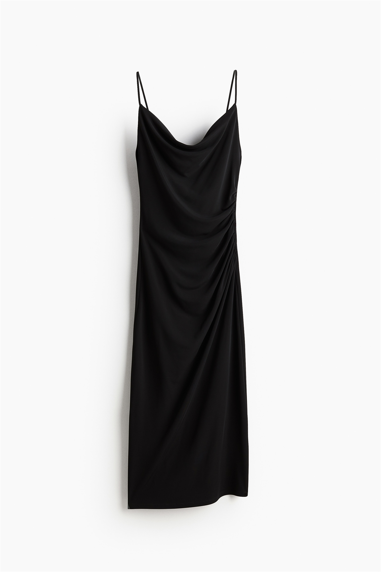 Платье длиной до колен из плотного трикотажа с легким блеском. Бретели-спагетти, вырез-коробочка и сборки с одной стороны для эффекта драпировки. Лиф на подкладке.