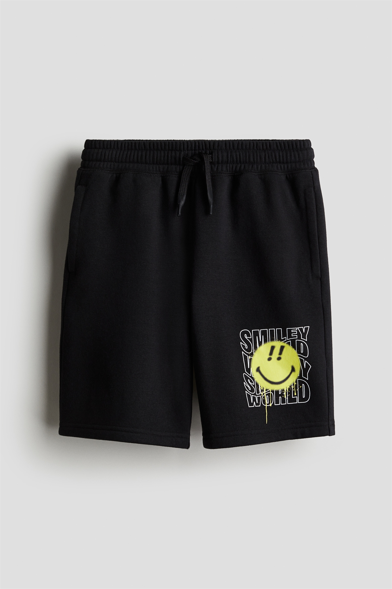 Шорты длиной до колена из толстовочной ткани с принтом на одной штанине и мягким начесом внутри. Эластичная резинка и шнурок на талии, боковые карманы и накладной задний карман.