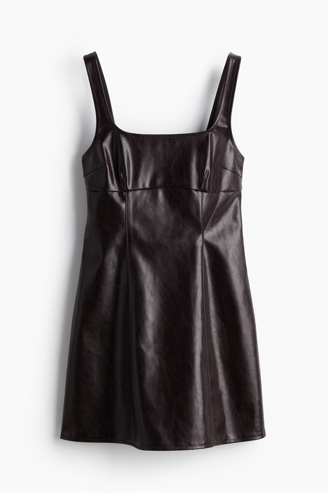 Короткое платье с глубоким круглым вырезом спереди и сзади, широкими бретелями и видимыми швами под бюстом, спереди и сзади. Приталенный лиф, потайная застежка-молния с одной стороны и расклешенная юбка. Без подкладки.
