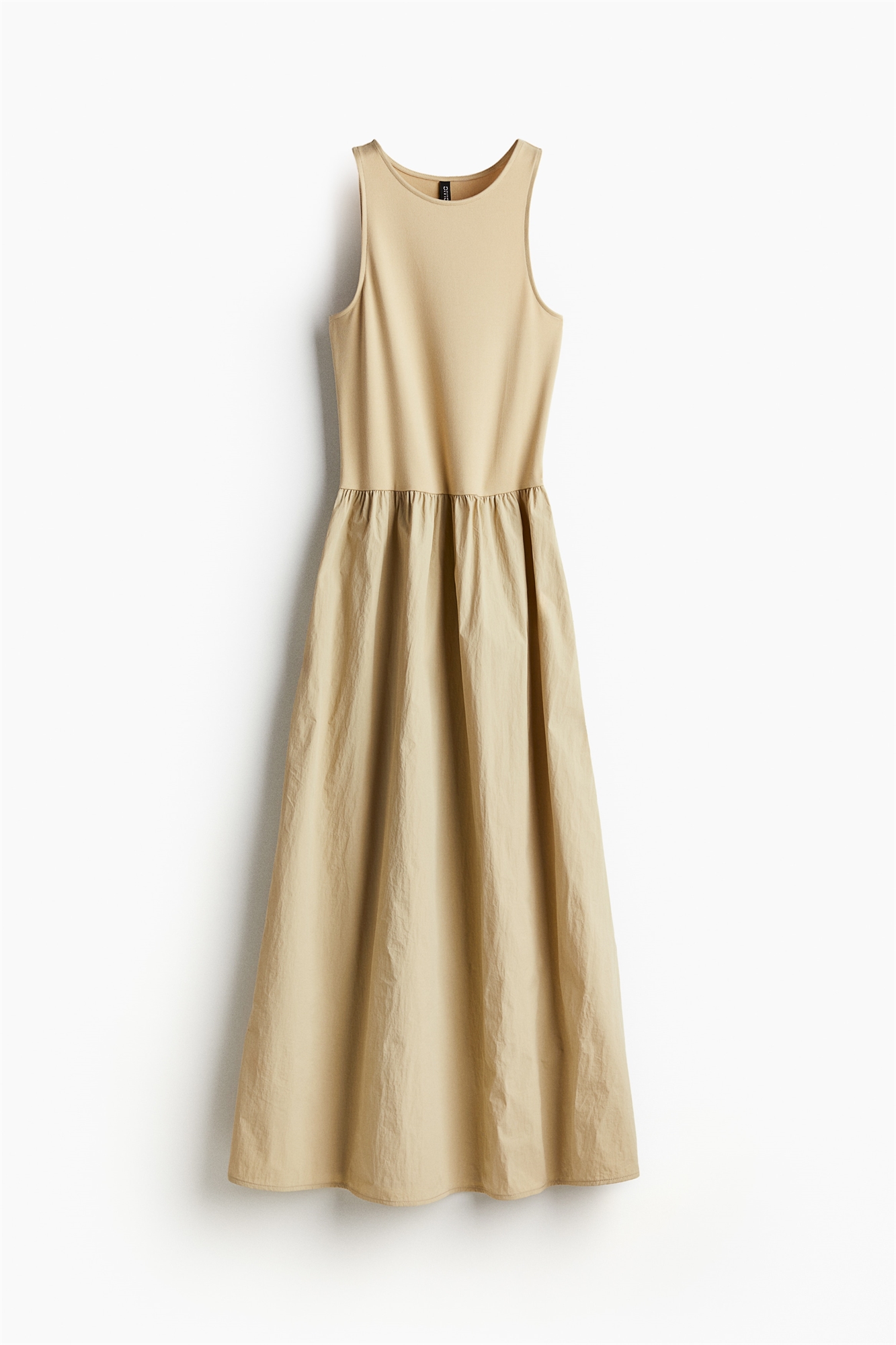 Платье длиной до колена с приталенным лифом из мягкого джерси и расклешенной юбкой из хрустящего нейлона. Силуэт без рукавов с круглым вырезом.