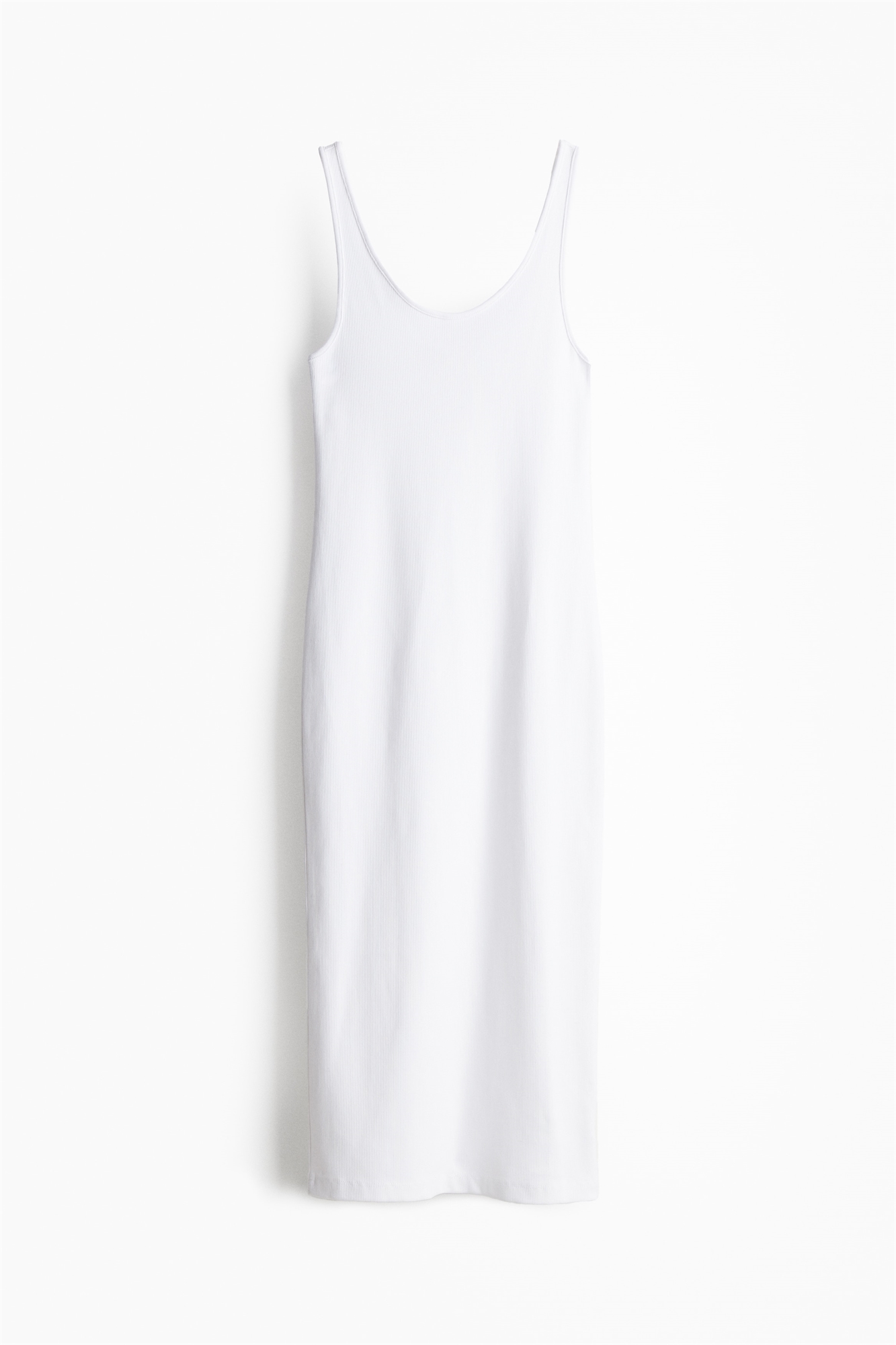 Приталенное платье длиной до колен из мягкого ребристого хлопкового джерси с широкими бретелями и глубоким круглым вырезом спереди и сзади.
