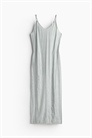 Приталенное платье длиной до колена из мятого атласа с оверлочными краями. V-образный вырез, перекрученные бретели и прямой подол с высоким разрезом сзади. Без подкладки.