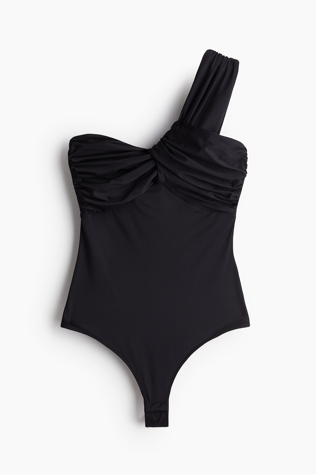 Боди стринги из эластичного джерси с асимметричным вырезом с драпировкой в верхней части и одной широкой бретелью. Скрытые кнопки в промежности.
