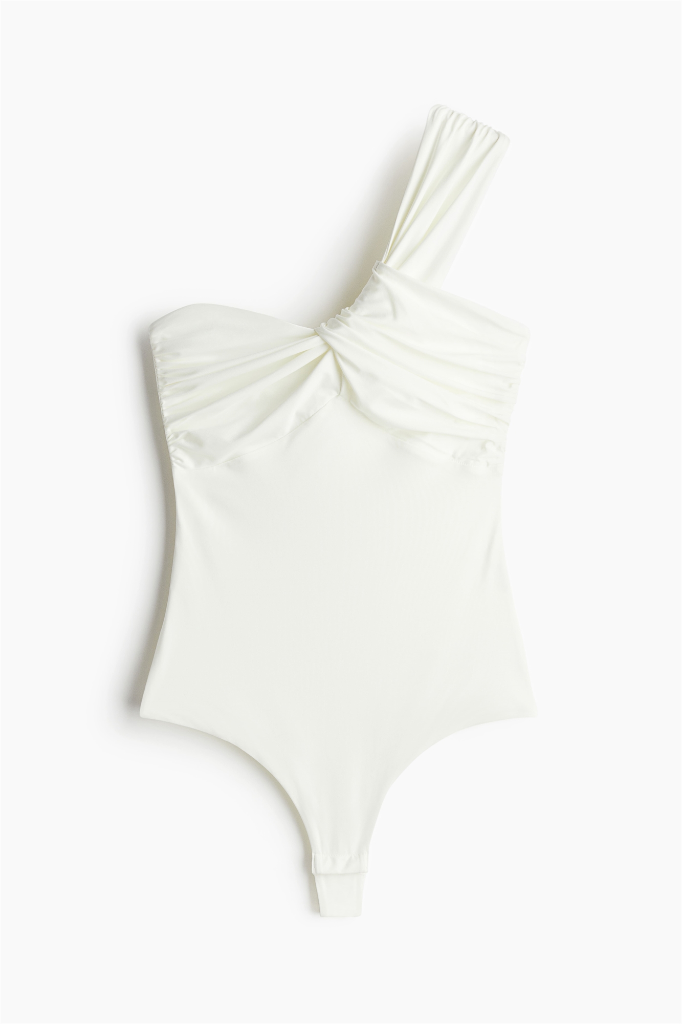 Боди стринги из эластичного джерси с асимметричным вырезом с драпировкой в верхней части и одной широкой бретелью. Скрытые кнопки в промежности.