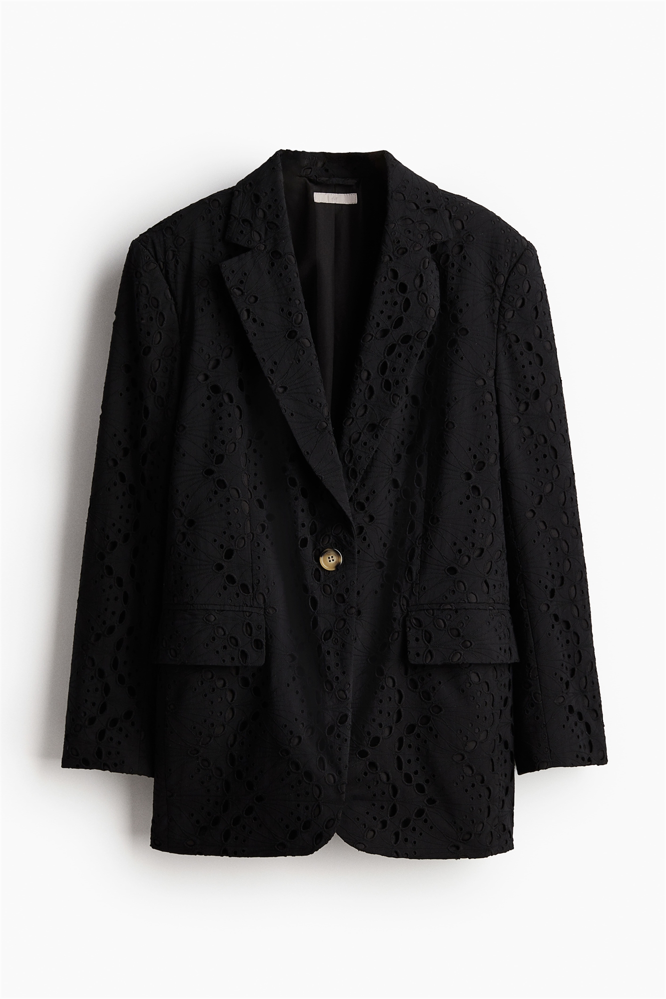 Однобортный блейзер больших размеров из хлопкового полотна с отделкой бродери англез. Лацканы с вырезом, одна пуговица спереди и втачные передние карманы с клапаном. Плечевые накладки и длинные рукава с декоративными пуговицами на манжетах. На подкладке.