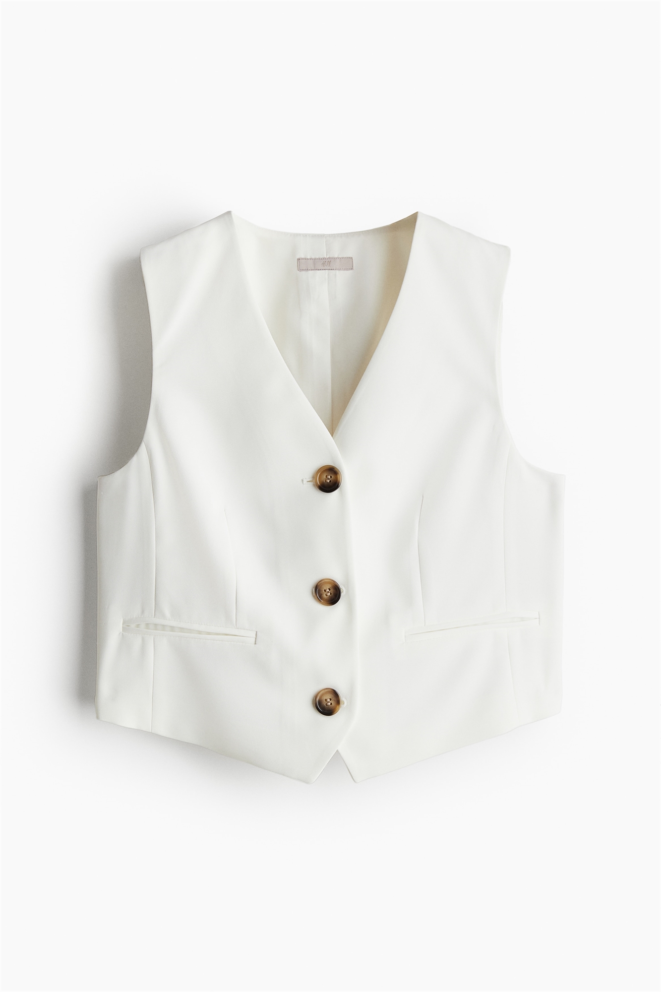 Короткий приталенный жилет из саржи с V-образным вырезом, застежкой на пуговицы и карманами с отделкой. На подкладке.