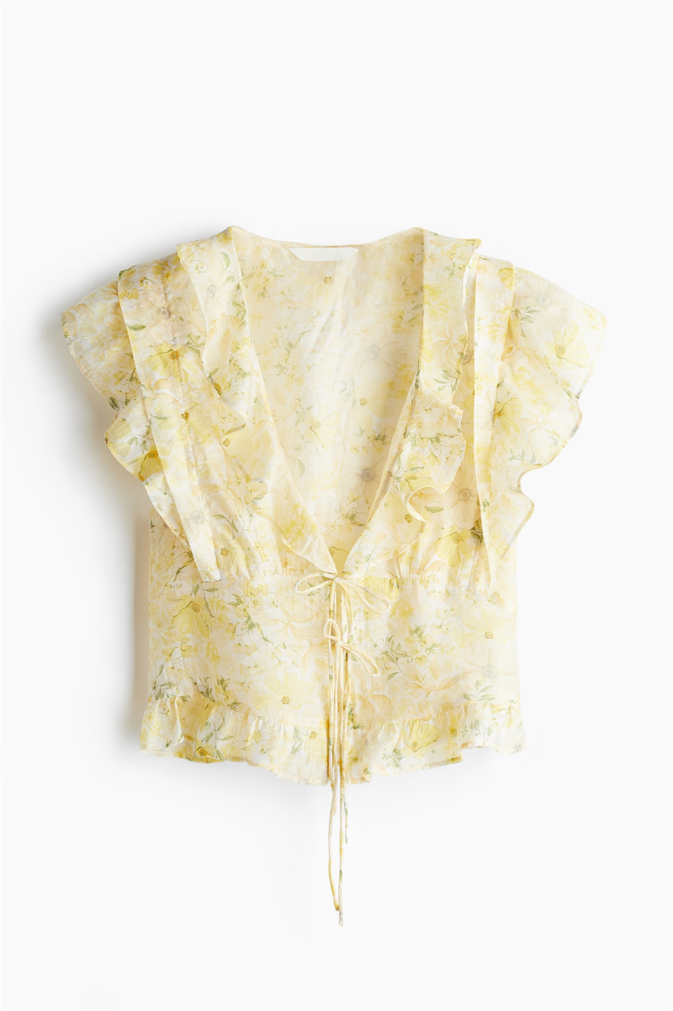 Короткая блузка из ткани с эффектом шелеста с глубоким V-образным вырезом и открытой передней частью с двумя парами завязок-спагетти. Рукава-воланчики и отделка оборками по вырезу и подолу.