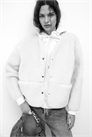 Жакет из мягкого тедди с круглым вырезом и застежками на кнопках спереди. Свободный крой с опущенными плечами, длинными рукавами и неброскими карманами спереди. Без подкладки.