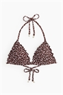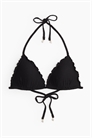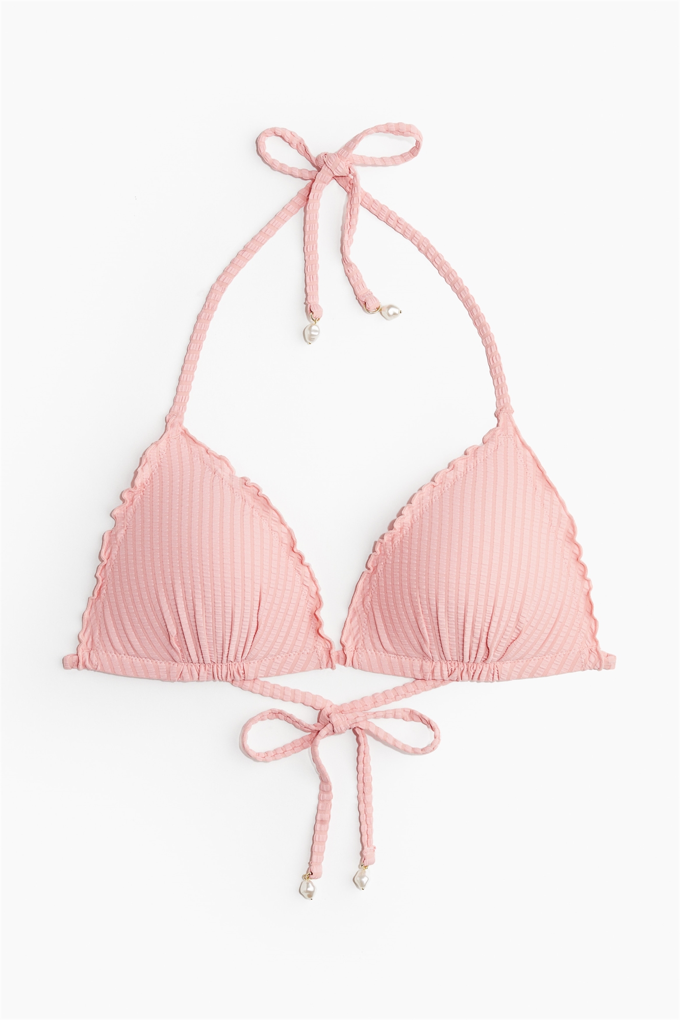 Треугольный бикини на подкладке, без проводов, с оверлочными краями и мягкими чашечками для увеличения бюста и декольте. Завязки сзади и на шее с жемчужными бусинами на концах.