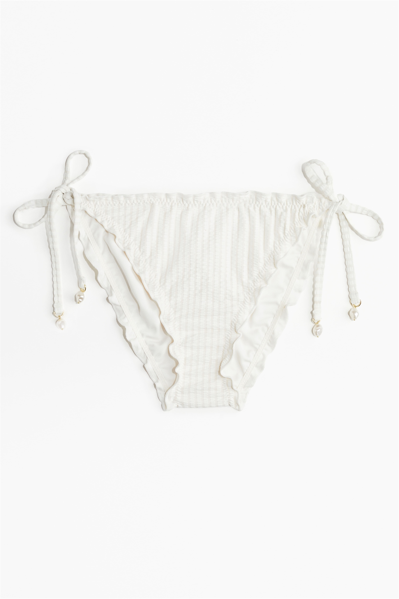 Трусики-бикини на подкладке с оверлочными краями. Средняя талия, среднее покрытие сзади и завязки по бокам с жемчужными бусинами на концах.