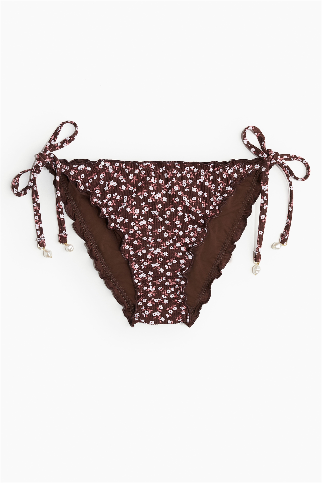 Трусики-бикини на подкладке с оверлочными краями. Средняя талия, среднее покрытие сзади и завязки по бокам с жемчужными бусинами на концах.
