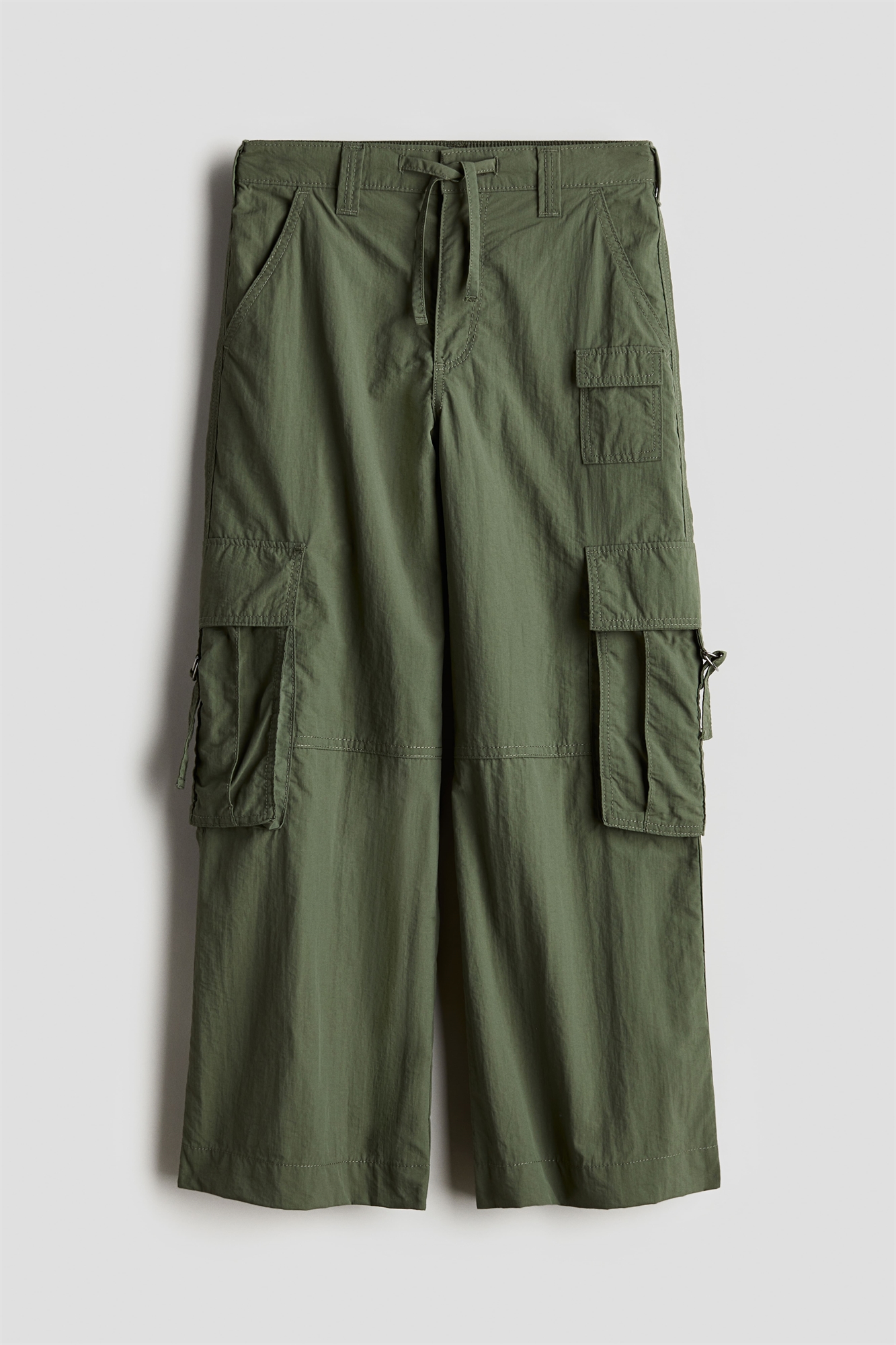 Свободные брюки-карго из нейлона с ширинкой на молнии и пуговице, закрытой эластичной резинкой сзади на талии и утягивающим шнурком спереди. Диагональные боковые карманы, накладные задние карманы с клапаном и широкие штанины с карманами с ремешком и D-кольцами.