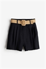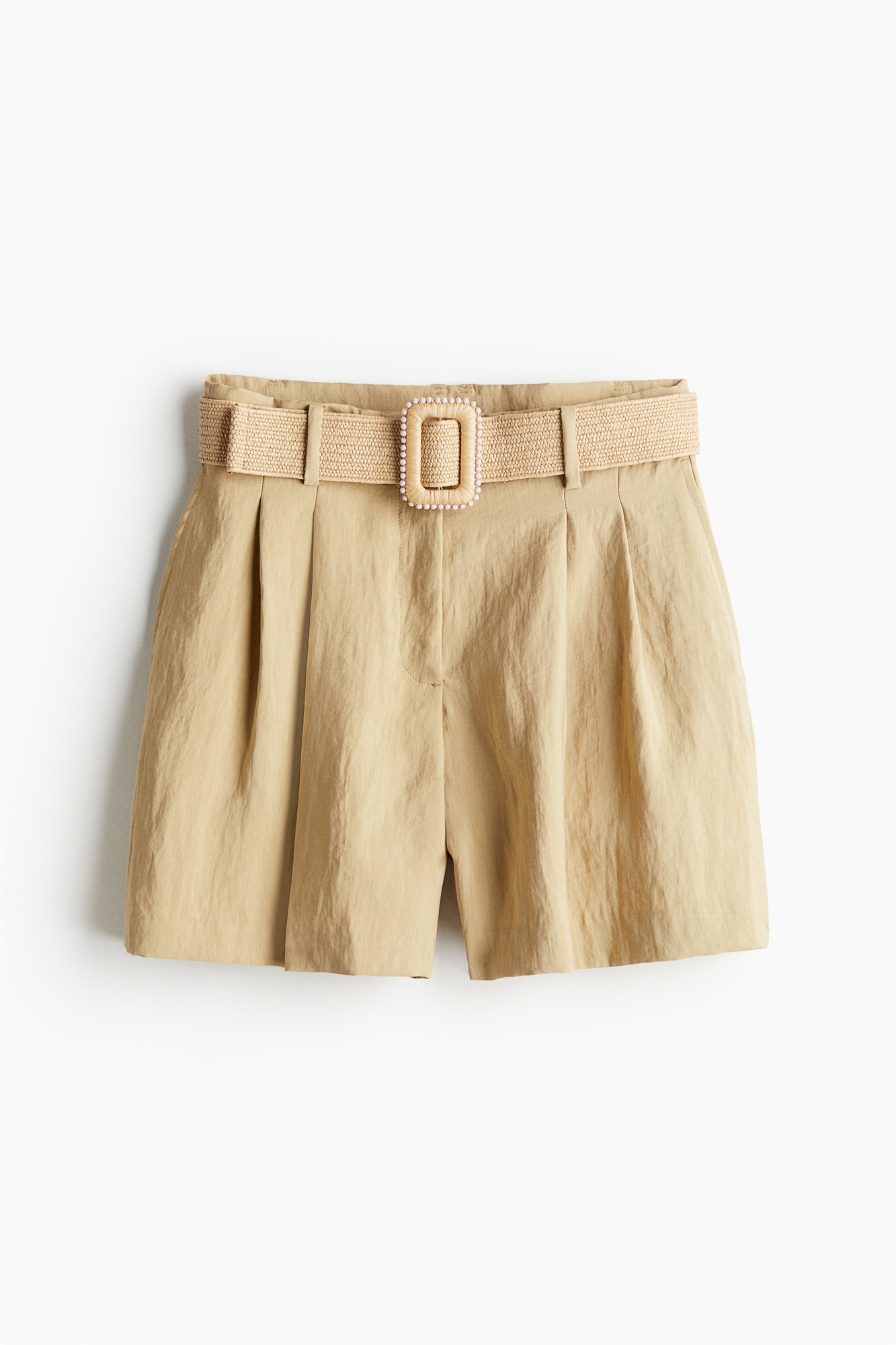 Шорты из саржи с высокой талией, широким съемным поясом и ширинкой на молнии с потайной застежкой на пуговицу и крючок с ушком. Свободный крой с неброскими боковыми карманами, втачными задними карманами и складками на ногах спереди.