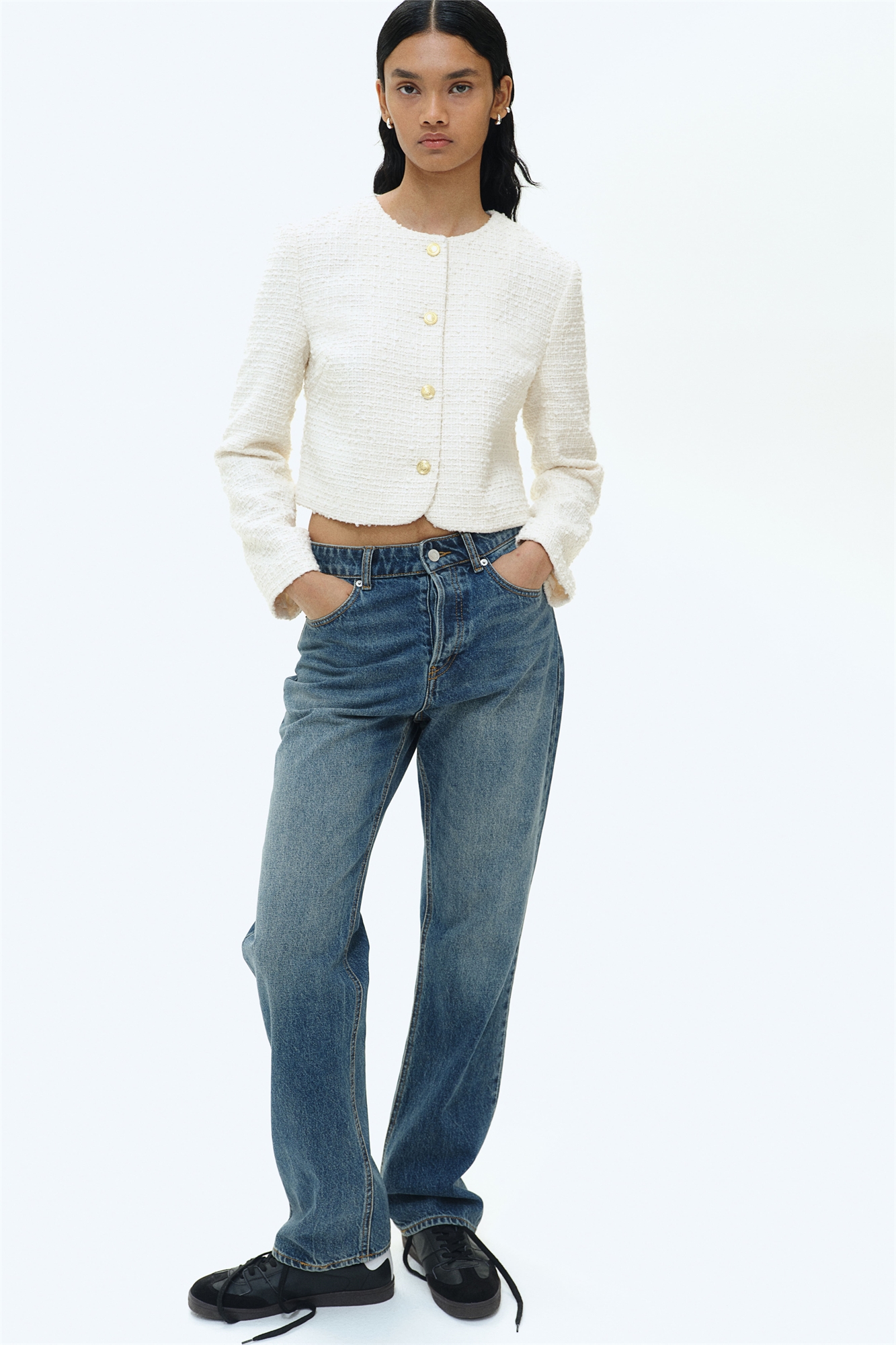 Короткий приталенный жакет из букле с круглым вырезом, пуговицами спереди и длинными рукавами. На подкладке.