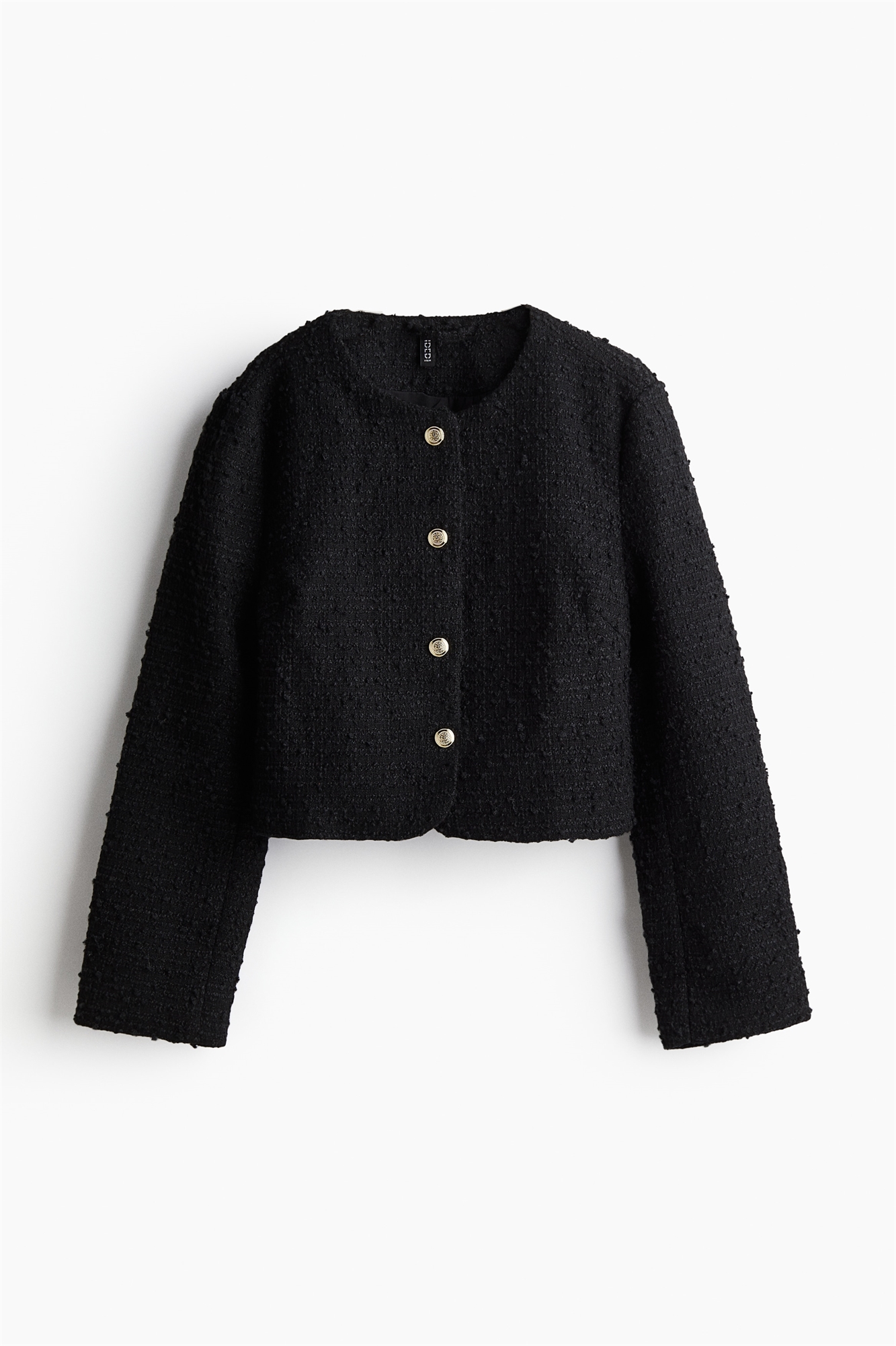 Короткий приталенный жакет из букле с круглым вырезом, пуговицами спереди и длинными рукавами. На подкладке.