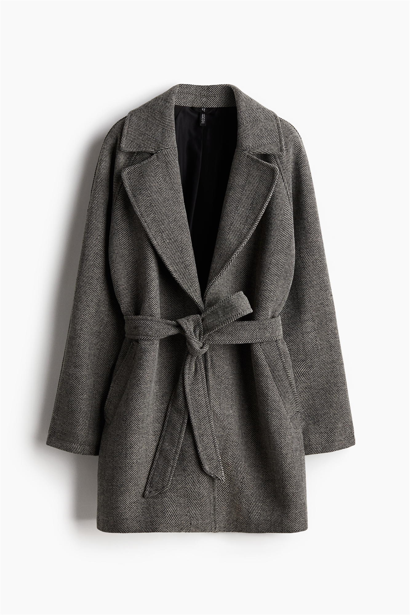 Короткое пальто свободного кроя из мягкой войлочной ткани с воротником, лацканами с вырезами и длинными рукавами реглан. Съемный пояс на талии и прорезные передние карманы. На подкладке.