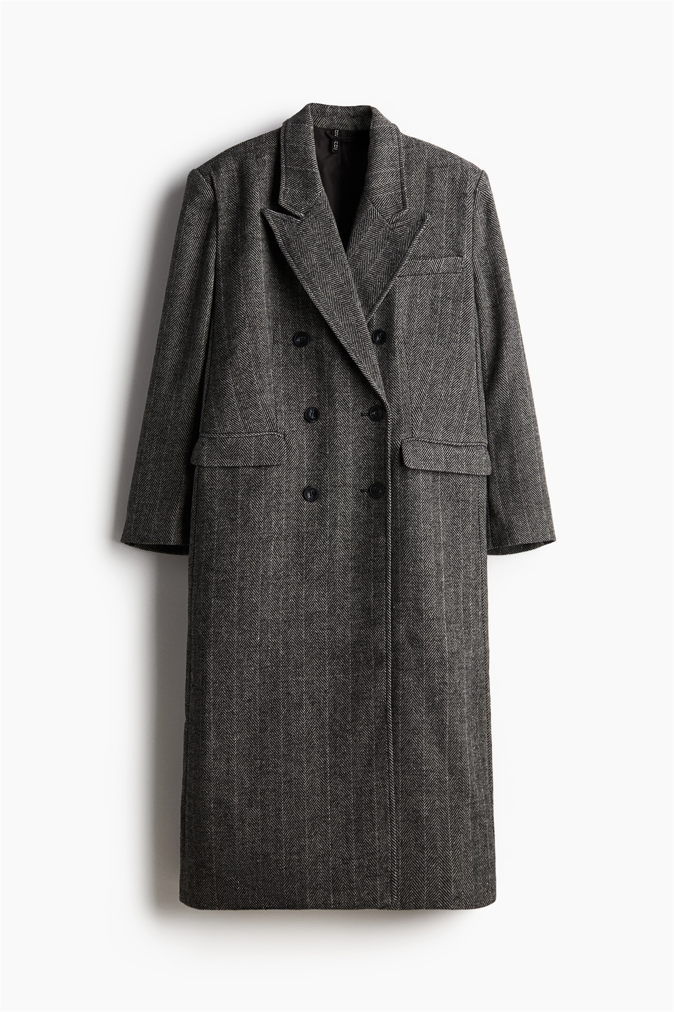 Двубортное пальто длиной до колен из тканого материала с воротником, широкими пикообразными лацканами и пуговицами спереди. Накладки на плечах, манжеты на пуговицах, нагрудный карман, накладные передние карманы и один задний клапан. На подкладке.