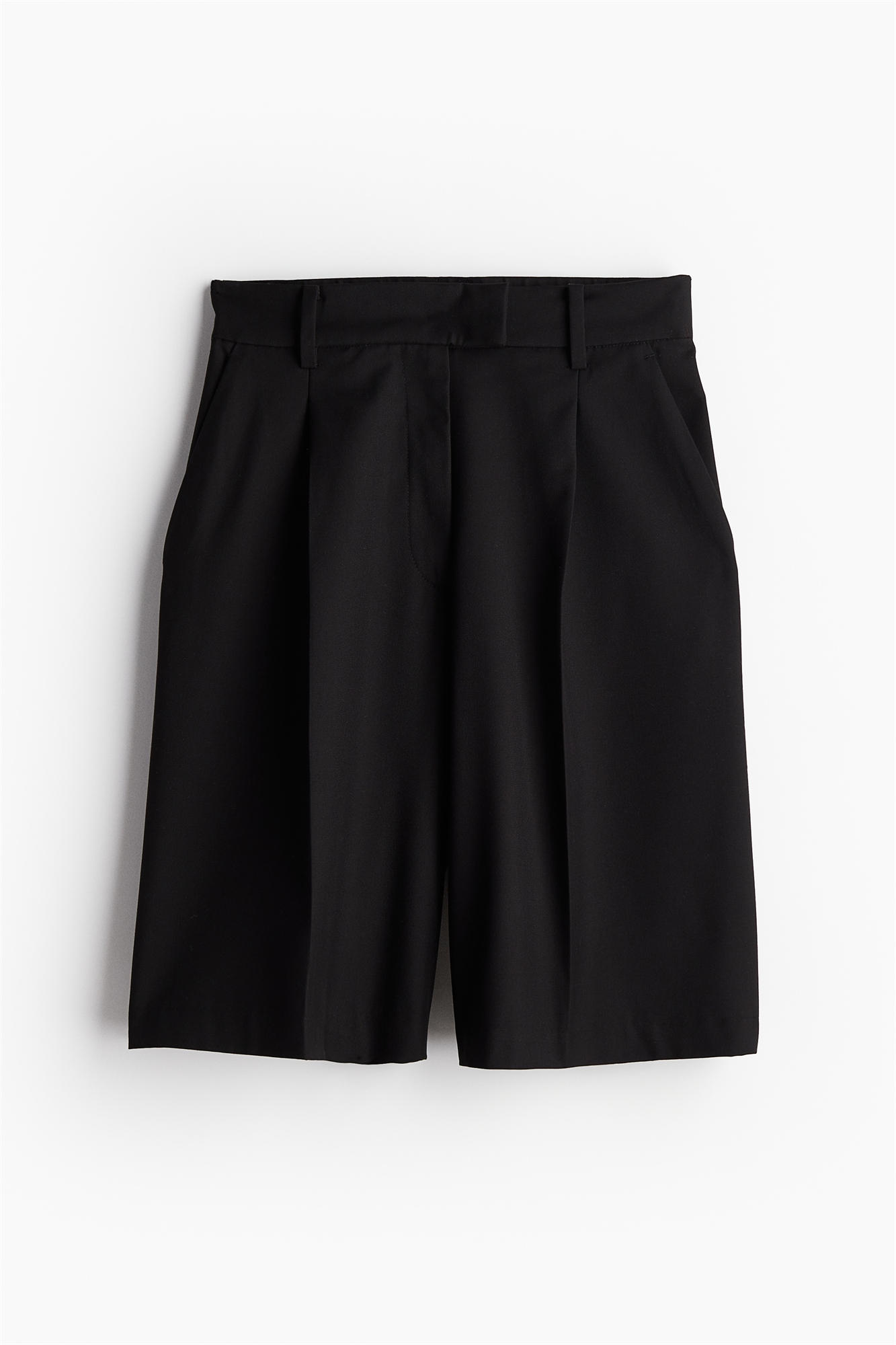 Шорты из тканого материала с высокой талией и эластичными вставками сзади, ширинкой на молнии и удлиненным поясом со скрытой застежкой на пуговицу и крючок с ушком. Свободный крой с диагональными боковыми карманами, втачными задними карманами и длиной до колена со складками в верхней части и складками спереди и сзади.