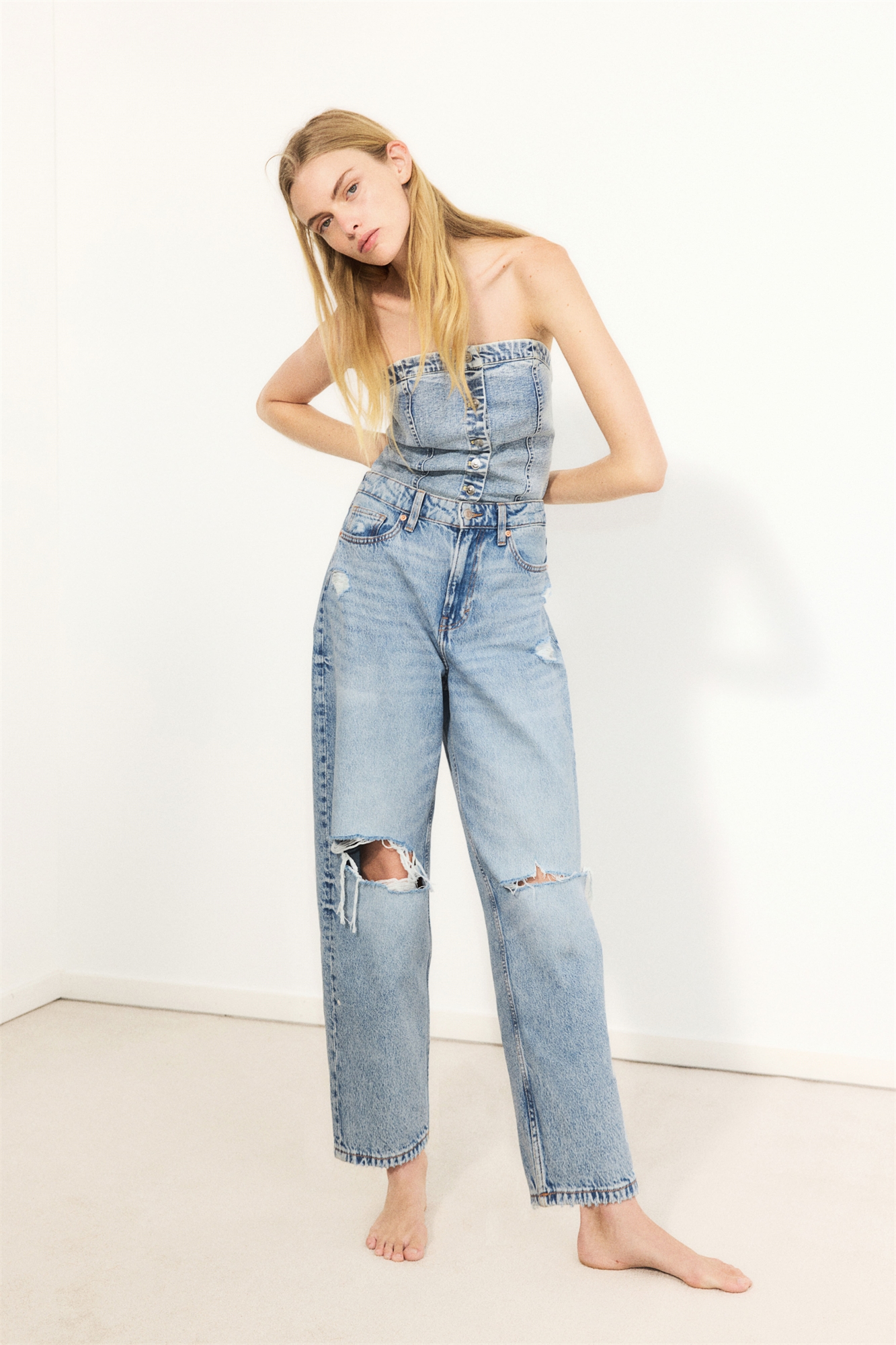 Джинсы с 5 карманами из жесткого хлопкового денима, который сначала кажется упругим, но затем смягчается и ослабевает при носке. Изогнутая, объемная штанина со свободной посадкой от бедра до бедра, которая сужается к подолу. Высокая талия с ширинкой на молнии и пуговице. Регулярная длина, рассчитанная на то, чтобы доходить до верхней части стопы с минимальной или нулевой стопой. Непринужденная и прохладная джинсовая одежда.