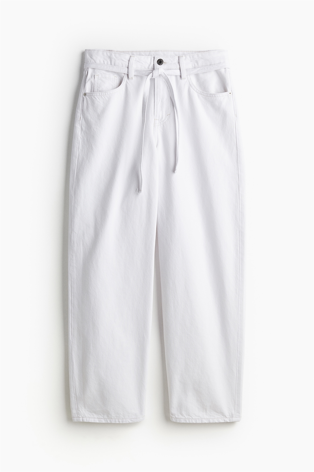 Джинсы с 5 карманами из жесткого денима, который сначала кажется твердым, но затем смягчается и ослабевает по мере носки. Прямые штанины с очень свободной посадкой от талии до бедер и очень свободной посадкой от бедер до подола. Заниженная талия с ширинкой на молнии и пуговице и узким съемным поясом-завязкой. Удлиненная длина, созданная для того, чтобы ниспадать по ноге с эффектом укладки. Образ в стиле 90-х.