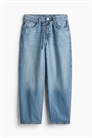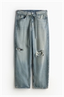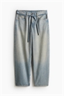 Джинсы с 5 карманами из жесткого денима, который сначала кажется твердым, но затем смягчается и ослабевает по мере носки. Прямые штанины с очень свободной посадкой от талии до бедер и очень свободной посадкой от бедер до подола. Заниженная талия с ширинкой на молнии и пуговице и узким съемным поясом-завязкой. Удлиненная длина, созданная для того, чтобы ниспадать по ноге с эффектом укладки. Образ в стиле 90-х.