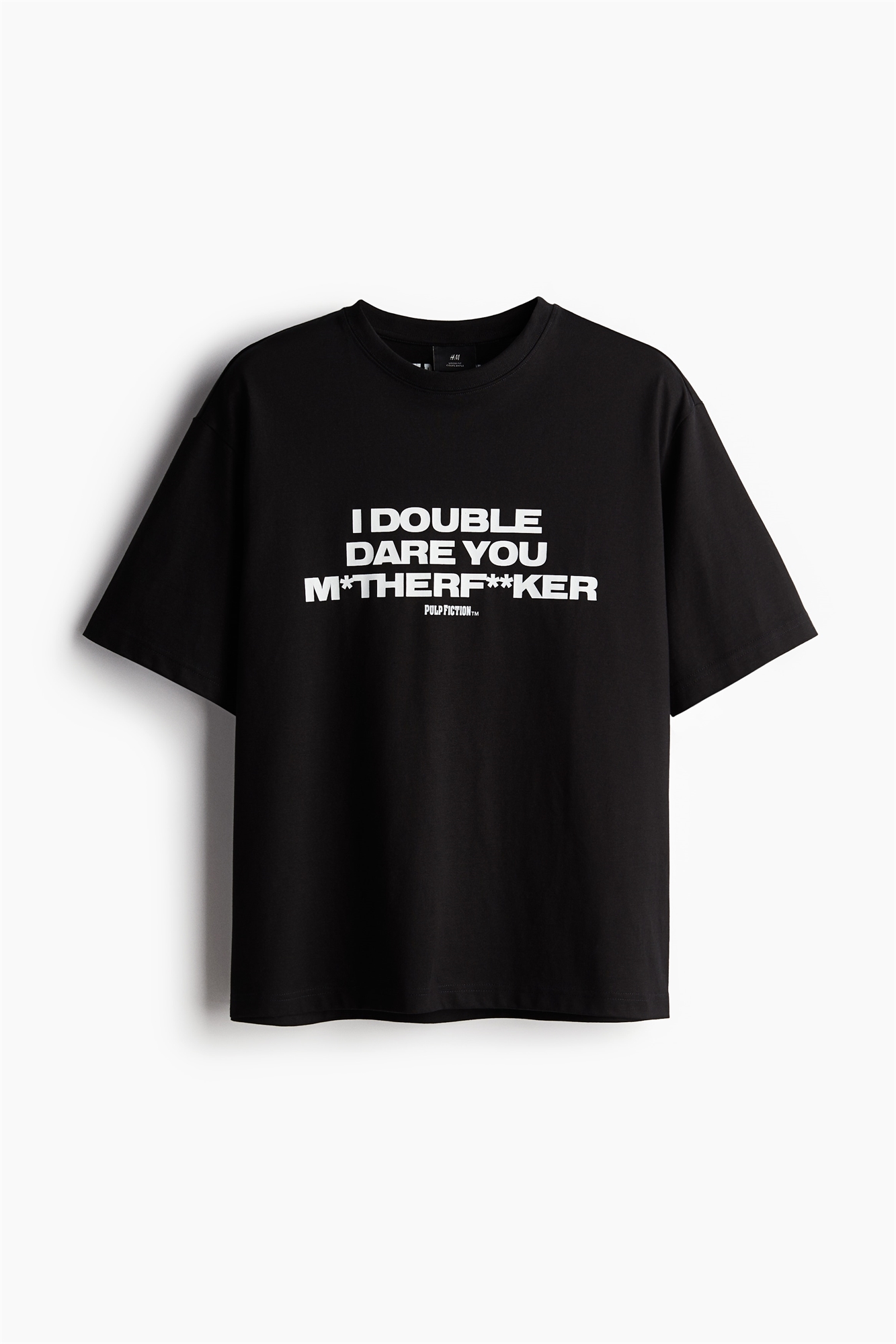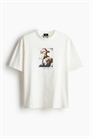 Футболка из плотного хлопкового джерси с принтом, ребристым круглым вырезом, спущенными плечами и прямым подолом. Свободный крой с объемным, но не чрезмерным силуэтом.