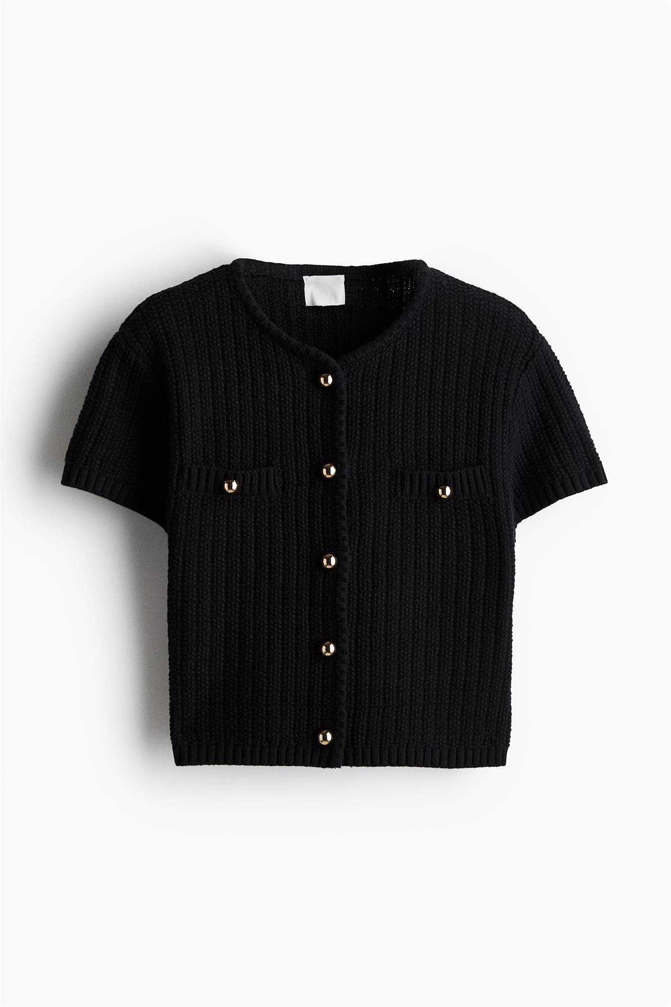 Короткий приталенный кардиган из структурированного трикотажа с круглым вырезом, пуговицами спереди, накладными нагрудными карманами с пуговицей и короткими рукавами.