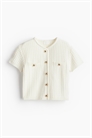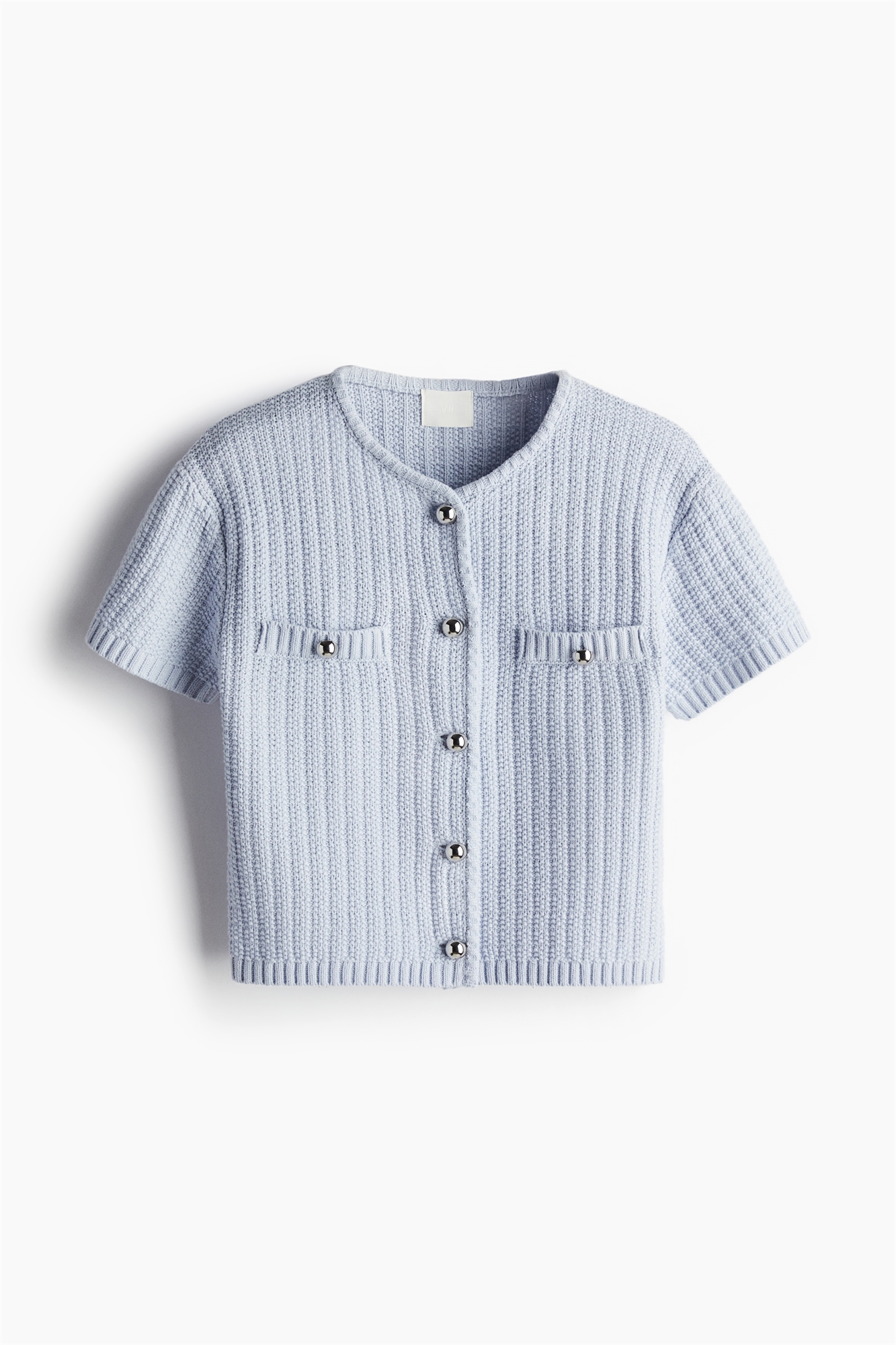 Короткий приталенный кардиган из структурированного трикотажа с круглым вырезом, пуговицами спереди, накладными нагрудными карманами с пуговицей и короткими рукавами.