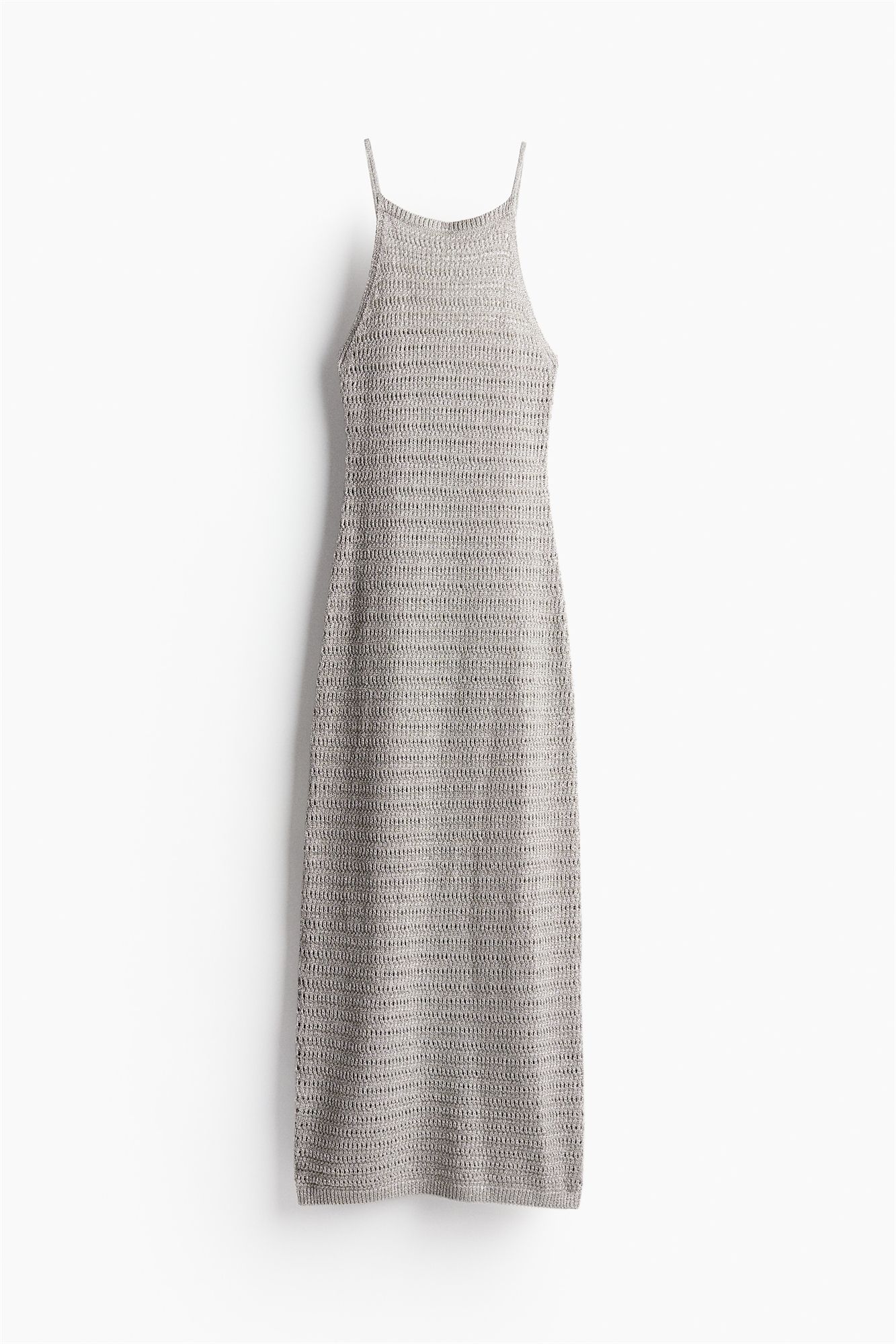 Приталенное платье длиной до колен из пуантельевого трикотажа с переливающимися металлическими нитями. Узкий крой в верхней части с прямым вырезом и узкими бретелями. Без подкладки.