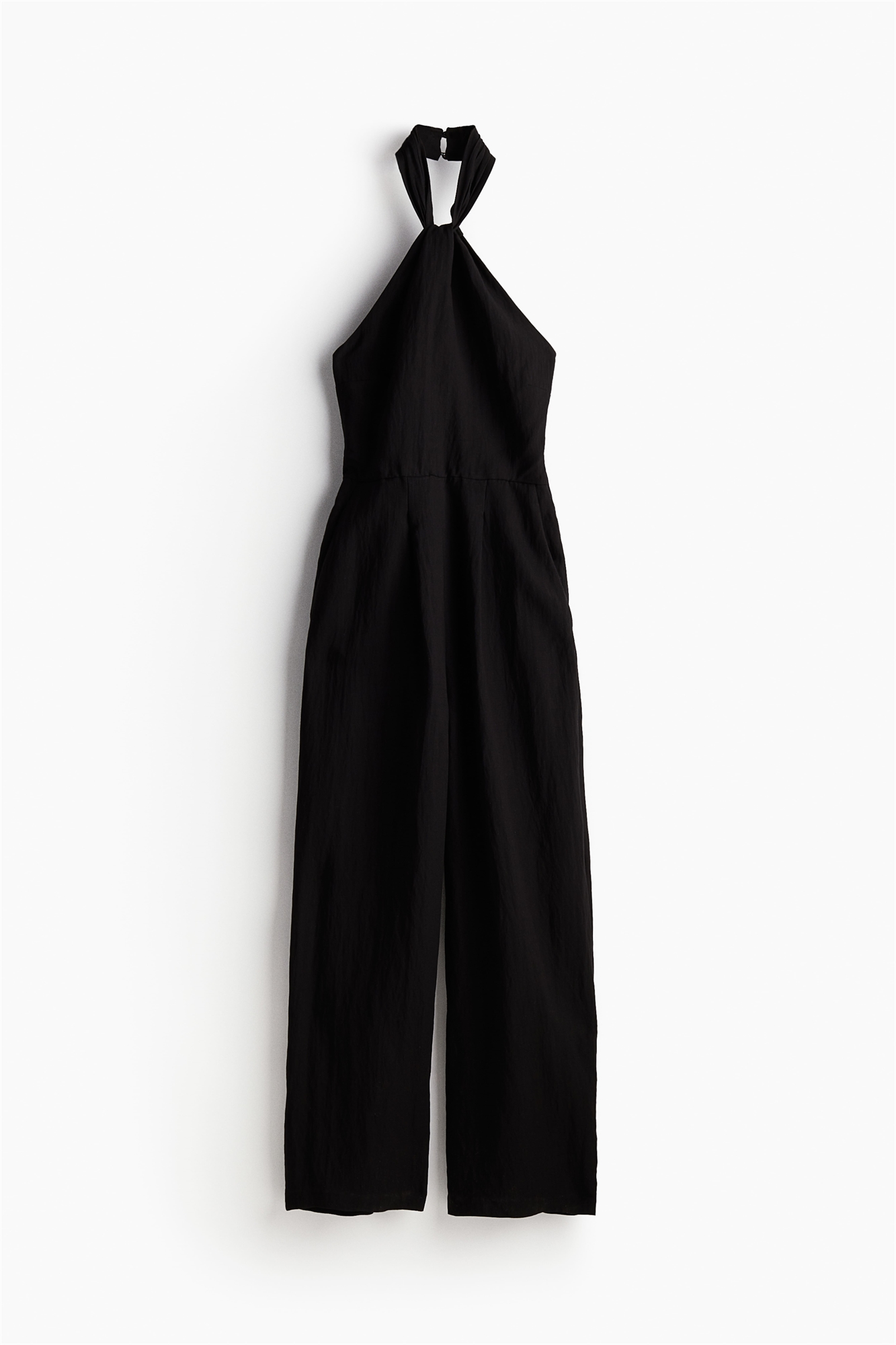 Джемпер из тканого материала с узким вырезом в верхней части, деталью в виде узла спереди и широкими бретелями с закрытыми пуговицами сзади на шее. Потайная застежка-молния с одной стороны, узкая резинка на талии, диагональные боковые карманы и широкие ножки со складками спереди.