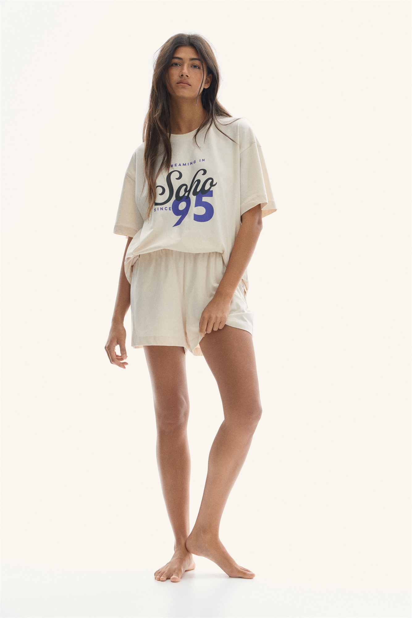 Пижама с футболкой и шортами из мягкого хлопкового джерси с набивным рисунком. Футболка с ребристой отделкой по вырезу горловины и спущенными плечами. Шорты с эластичной резинкой на талии.