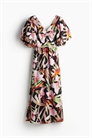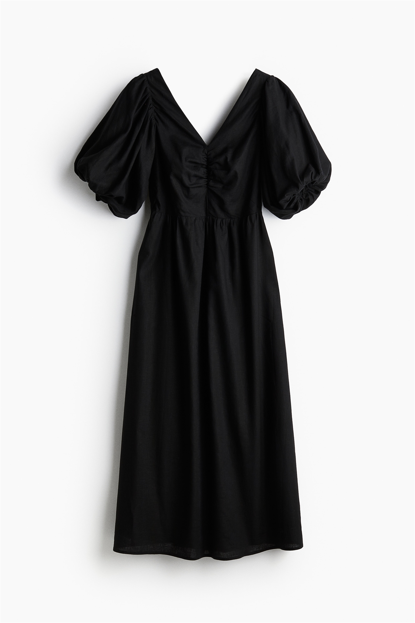 Платье длиной до колен из льна и вискозы с глубоким V-образным вырезом со сборкой спереди и открытой спиной с широкими завязками, застегивающимися на бант. Короткие рукава-баллон с эластичными манжетами, узкая резинка на талии и расклешенная юбка. На подкладке.