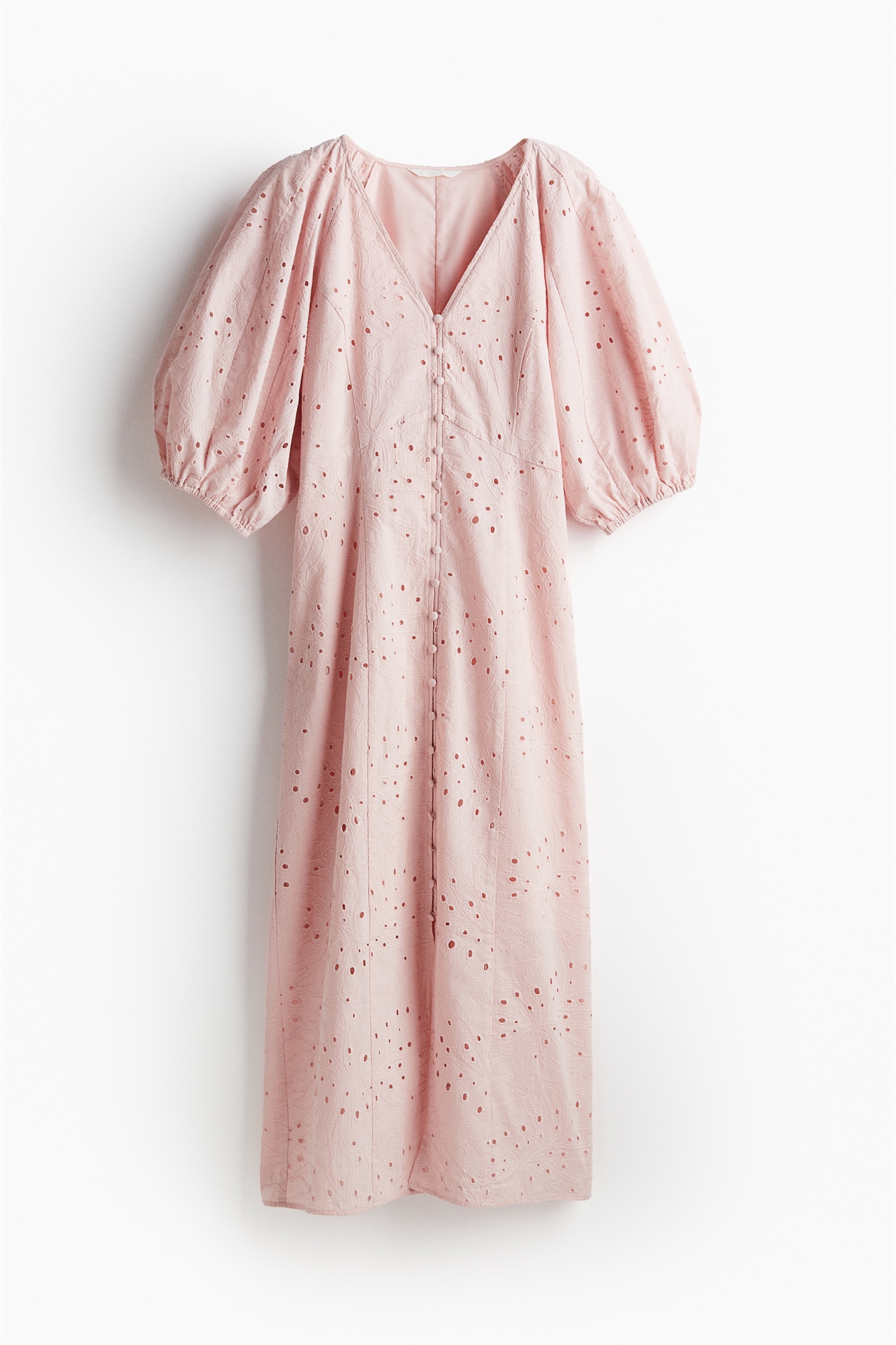 Приталенное платье длиной до колена из воздушного хлопкового полотна с отделкой бродери-англиз. Глубокий V-образный вырез, застежка на пуговицы спереди и рукава-баллоны длиной 3/4 покроя реглан с узкими эластичными манжетами. На подкладке.