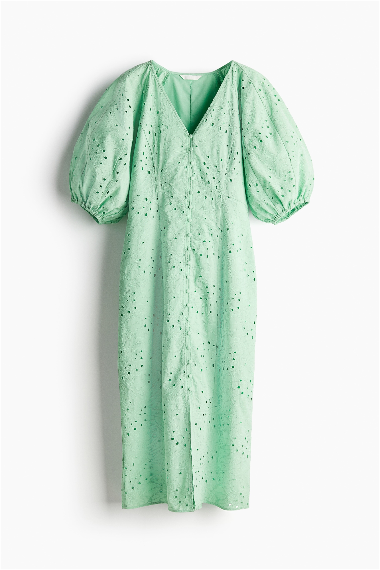 Приталенное платье длиной до колена из воздушного хлопкового полотна с отделкой бродери-англиз. Глубокий V-образный вырез, застежка на пуговицы спереди и рукава-баллоны длиной 3/4 покроя реглан с узкими эластичными манжетами. На подкладке.