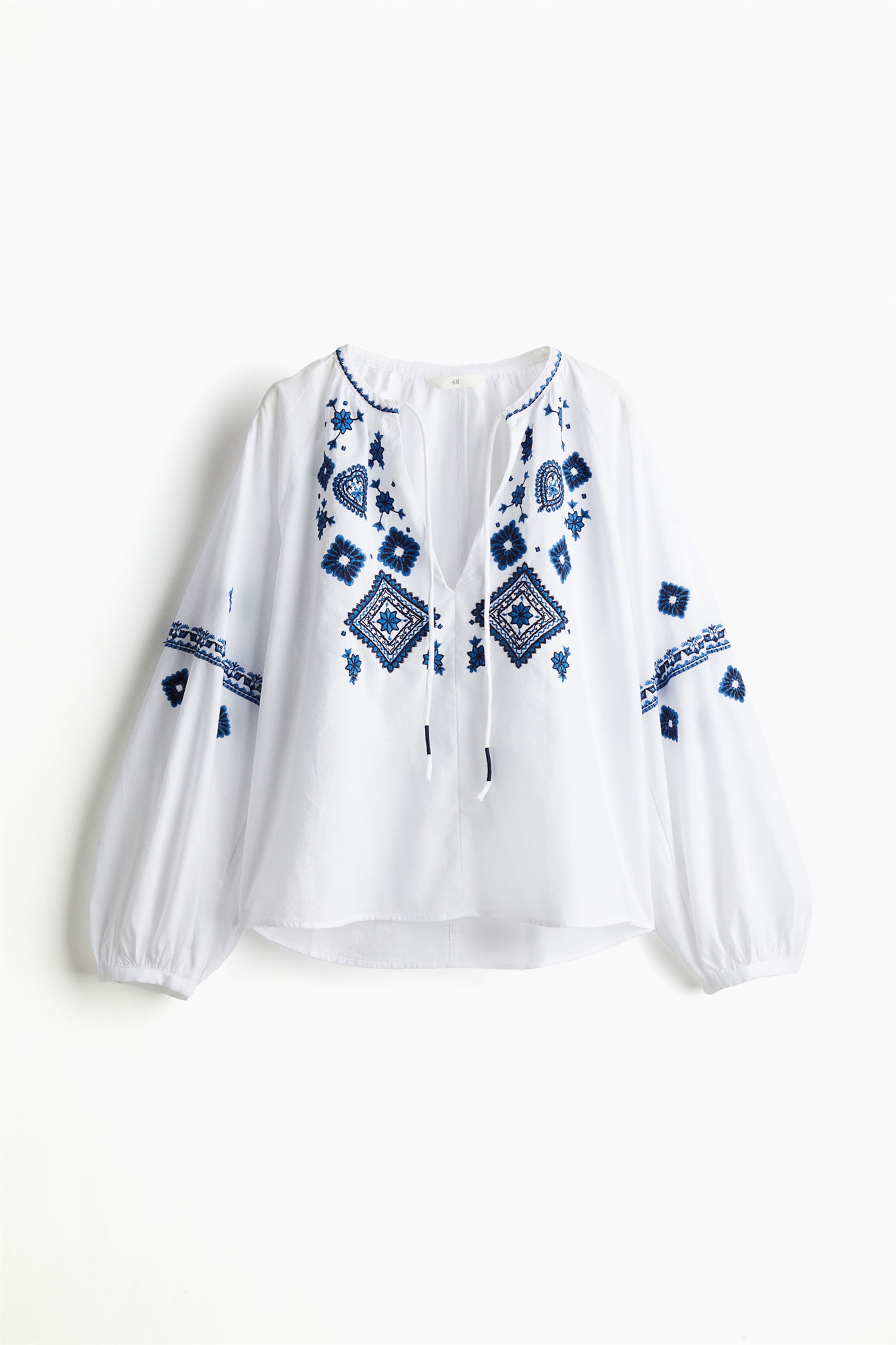 Блузка из воздушного хлопкового полотна с вышивкой спереди, по вырезу горловины и на рукавах. Свободный крой с круглым вырезом с завязками и V-образной проймой спереди. Длинные рукава-баллоны покроя реглан с узкими манжетами.