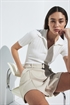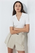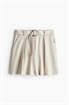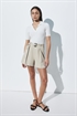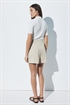 Шорты из плотного трикотажа с высокой талией, эластичным поясом и пришитым ремнем с прямоугольной пряжкой спереди. Диагональные боковые карманы, складки в верхней части и пришитые складки спереди.