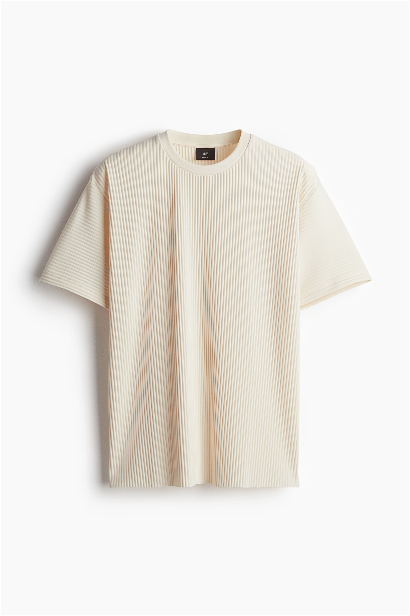 Футболка из плиссированного трикотажа с круглым вырезом в рубчик, спущенными плечами и прямым покроем. Свободный крой для пышного, но не слишком большого силуэта.