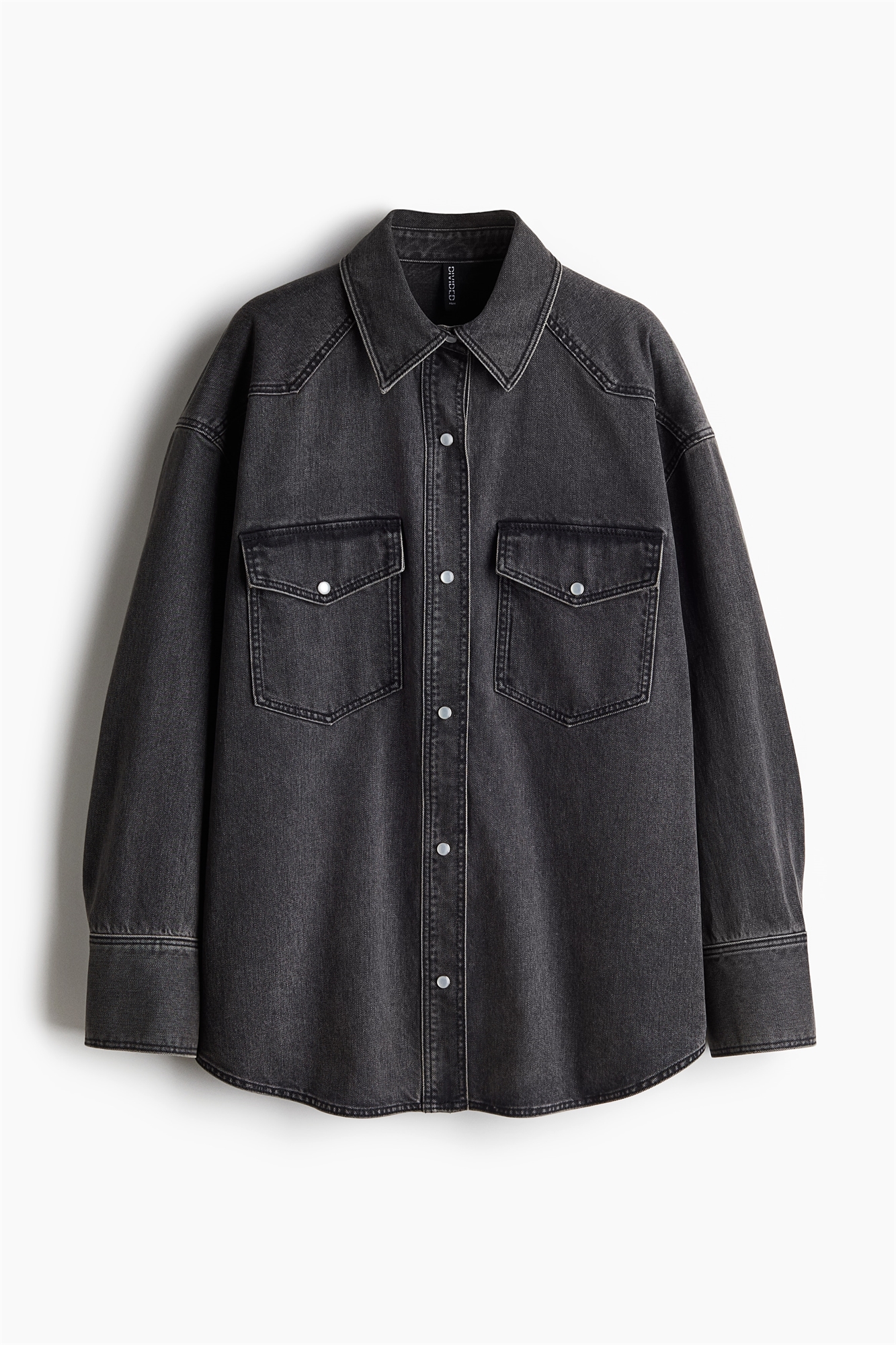 Рубашка в стиле вестерн в стиле оверсайз из плотного хлопкового денима с воротником, застежками на кнопках спереди и ярмом сзади. Спущенные плечи и длинные рукава с манжетами на кнопках. Накладные нагрудные карманы с застежкой на кнопки и аккуратно закругленный подол.