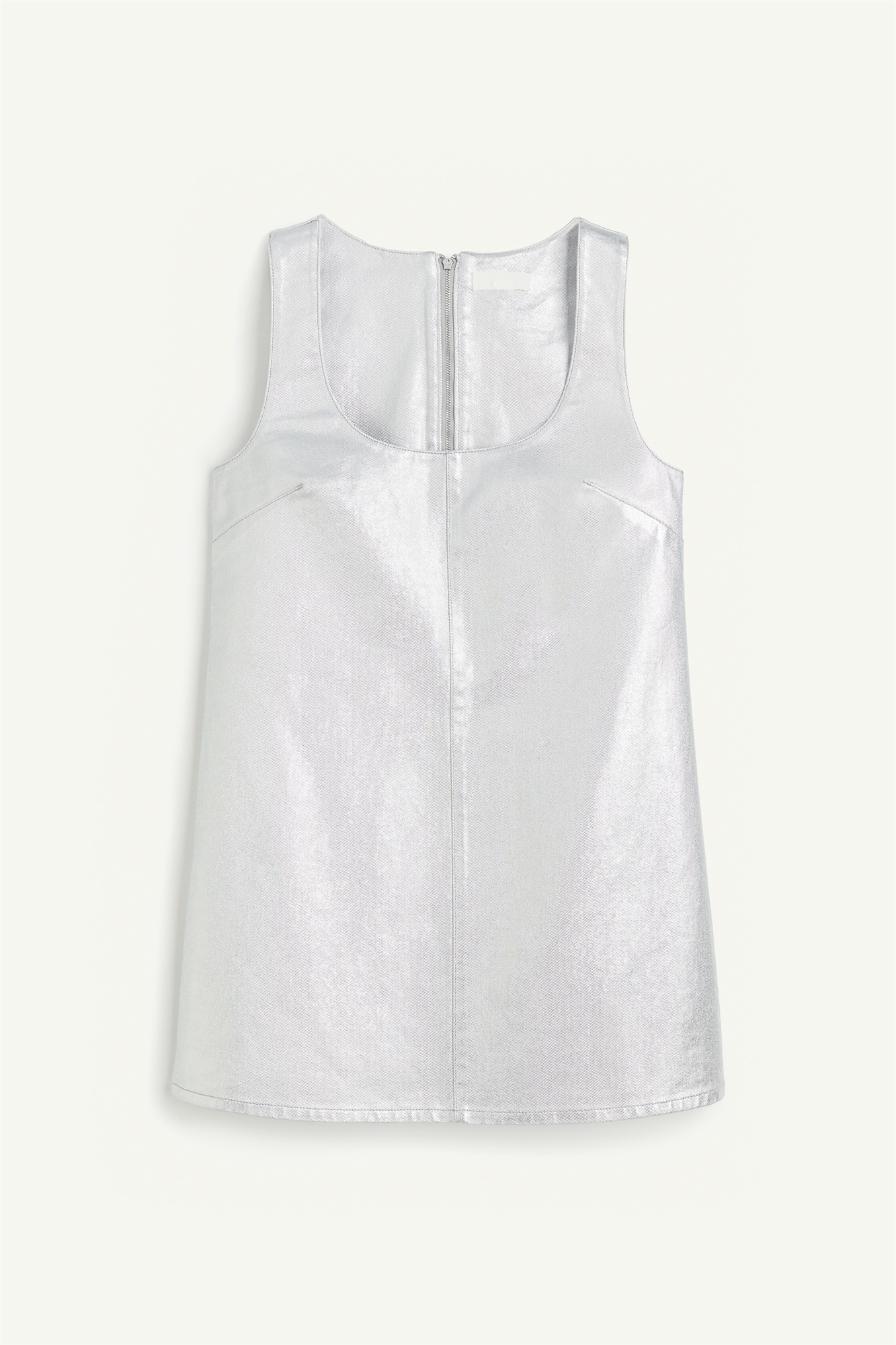 Короткое платье без рукавов из мелованного денима с мерцающей металлической отделкой. Вырез-лодочка, нагрудные вытачки и застежка-молния с завязками сзади. Без подкладки.
