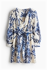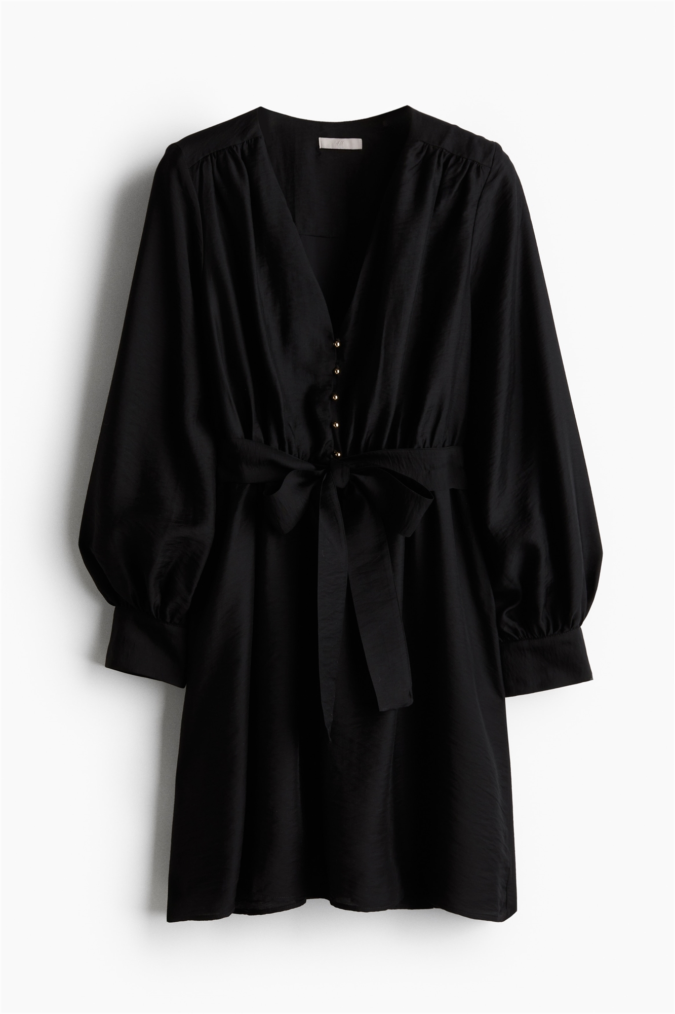 Короткое платье свободного покроя из тканого материала с глубоким V-образным вырезом и закрытыми пуговицами спереди. Двухслойное ярмо со складками на плечах, длинные рукава-баллоны и широкие манжеты с закрытыми пуговицами. Эластичная резинка и съемный пояс-завязка на талии, а также слегка расклешенная юбка. Без подкладки.