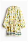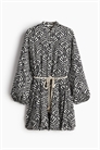 Короткое платье из хлопка и вискозы. Свободный крой с воротником-бантом, пуговицами в верхней части и съемным поясом из макраме на талии. Спущенные плечи, длинные рукава-баллоны и узкая окантовка с разрезом и пуговицей на манжетах. Без подкладки.