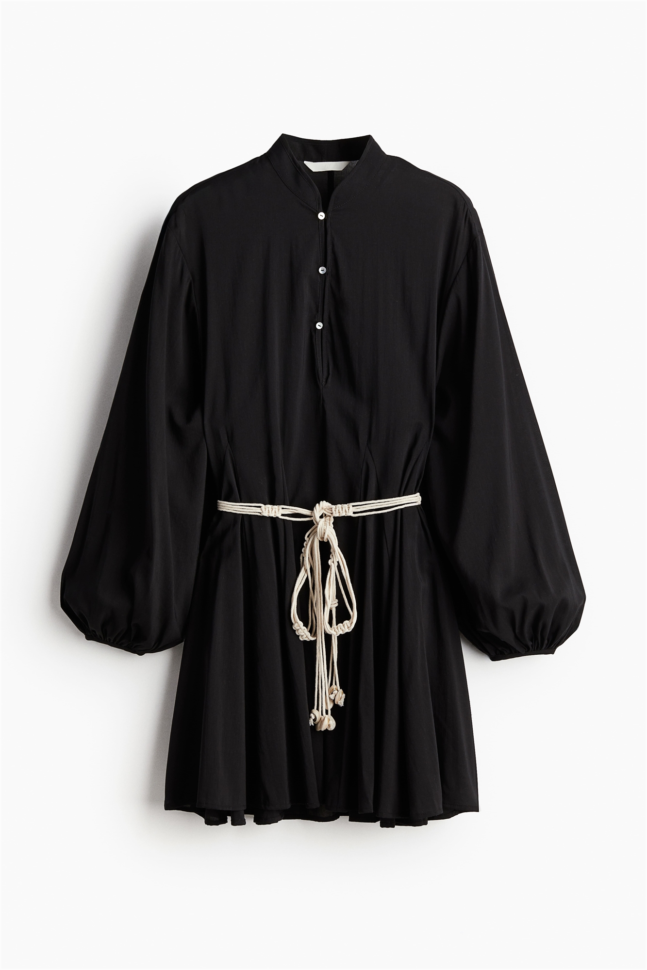 Короткое платье из хлопка и вискозы. Свободный крой с воротником-бантом, пуговицами в верхней части и съемным поясом из макраме на талии. Спущенные плечи, длинные рукава-баллоны и узкая окантовка с разрезом и пуговицей на манжетах. Без подкладки.