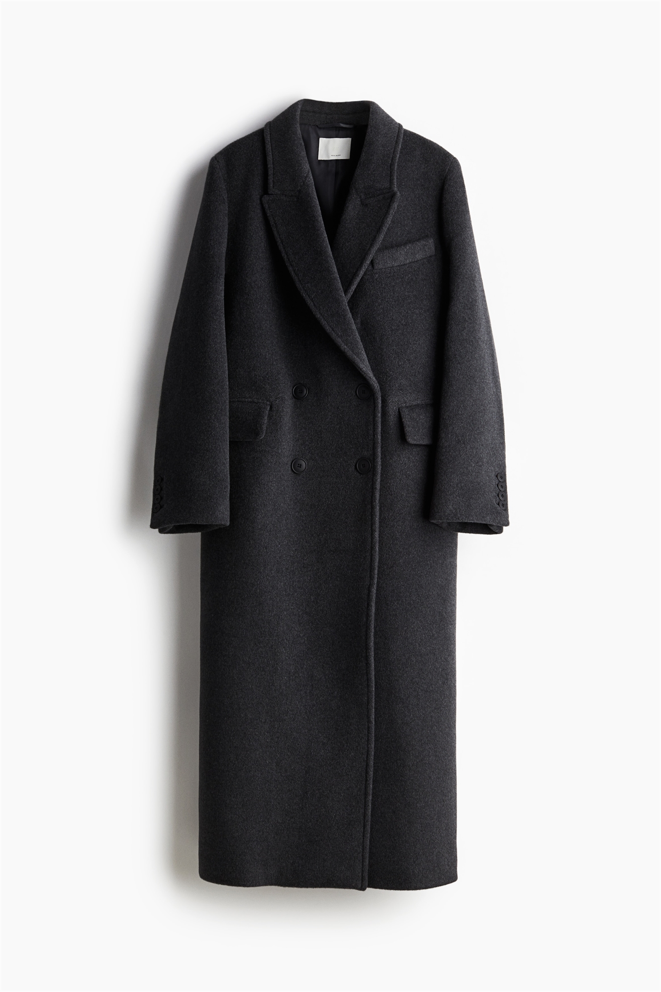Длинное двубортное пальто из микса войлочной шерсти. Свободный крой с пикообразными лацканами, пуговицы спереди, нагрудный карман и накладные передние карманы. Накладки на плечах и длинные рукава с манжетами на пуговицах. Одинарная вентиляция на спине. На подкладке.