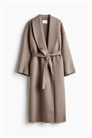 Пальто ручной работы из шерстяной смеси с войлоком длиной до колен. Свободный крой с шалевым воротником, съемным поясом-завязкой на талии и карманами в боковых швах. Спущенные плечи и длинные, слегка зауженные рукава. Без подкладки.