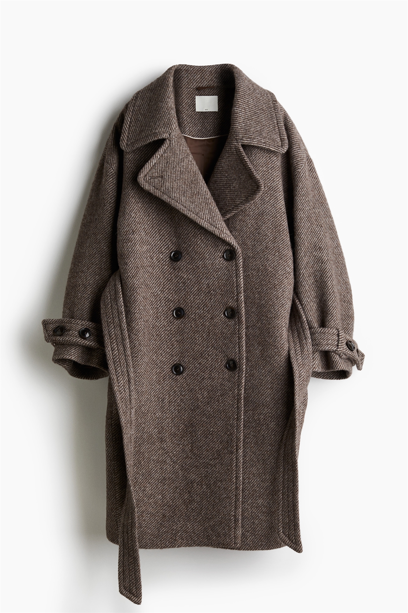 Двубортное пальто длиной до колен из шерсти с войлочным переплетением и завышенной посадкой. Широкие лацканы с вырезом, пуговицы спереди и широкий съемный пояс-завязка на талии. Спущенные плечи и манжеты на пуговицах. Прорезные карманы в боковых швах и один задний клапан. На подкладке.